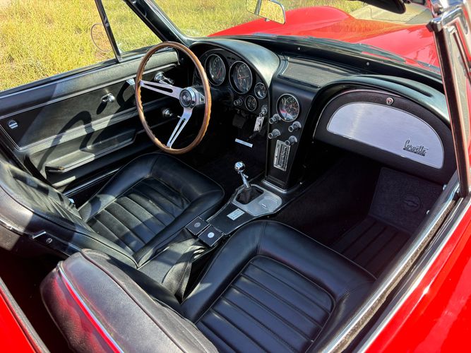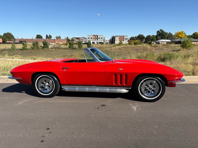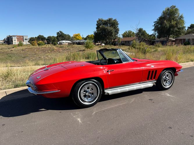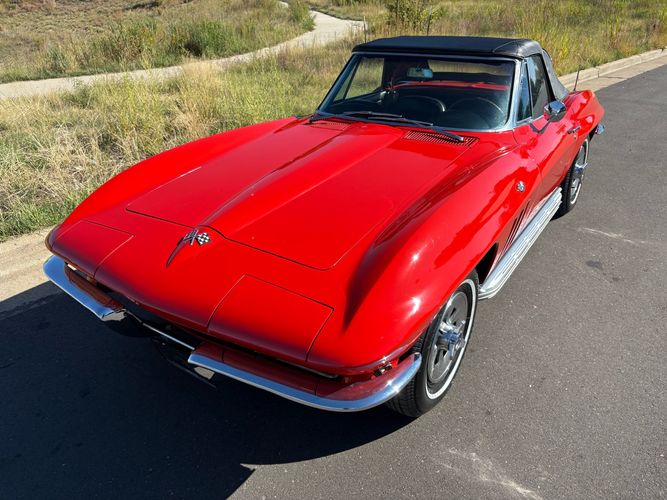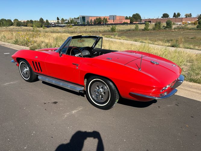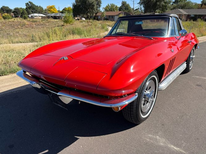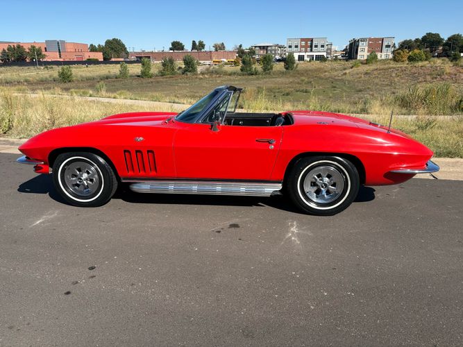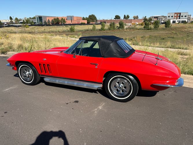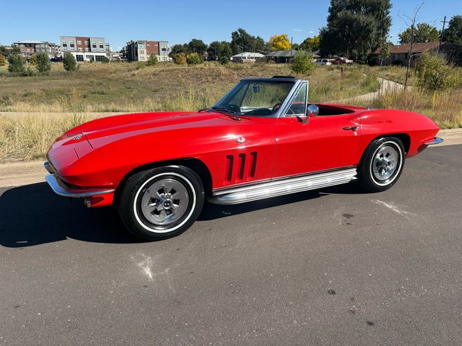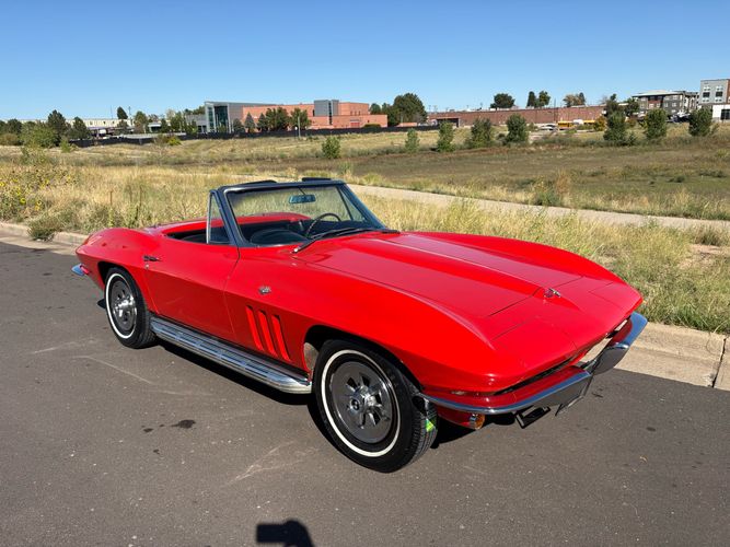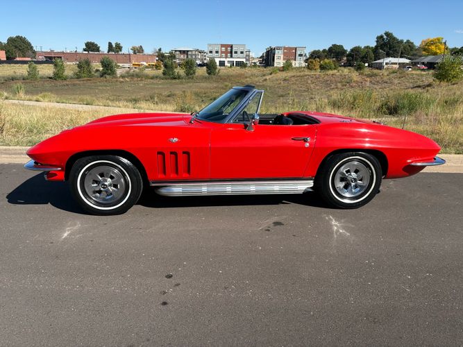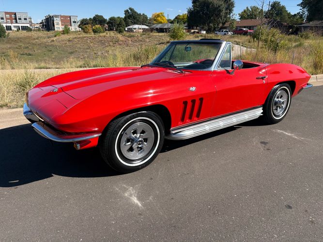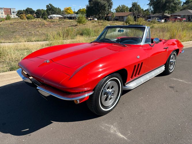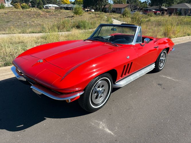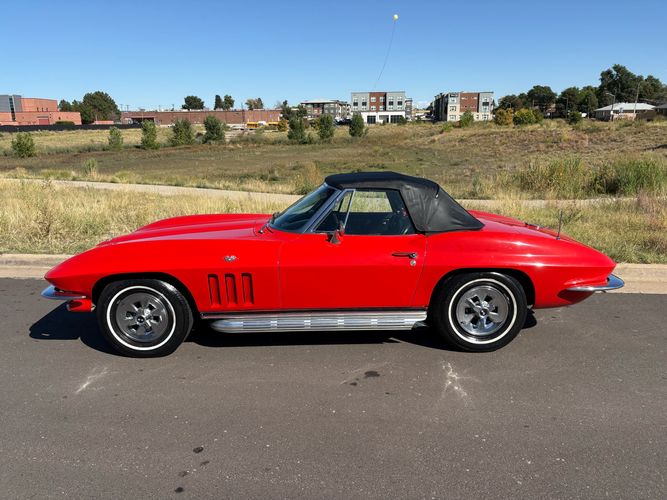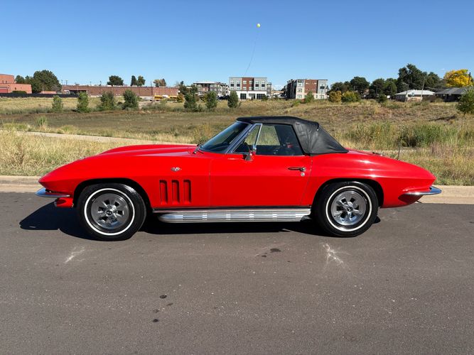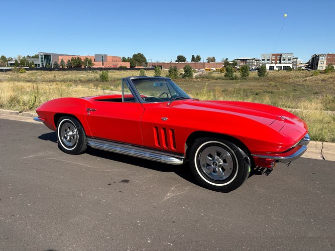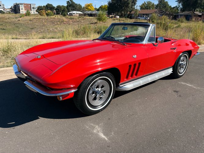 1966 Chevy Corvette stingray convertible very hard to find L79 350HP 327 with 4-speed. This Corvette convertible is finished in red exterior with a black soft top and looks good with the factory side pipes. This particular Corvette has a date code correct motor, but the block has been decked when it was rebuilt so it is a non-numbers matching. The interior is finished in black leather and is an amazing condition and has a brand new soft top. The exterior is also, in very nice condition and appears to not have ever had any collision damage as all the bonding strips are in place like they should be from the factory. We just had the car looked over and mechanically it is sound and ready for the new owner and got brand new tires installed. Call Weisco Motorcars for additional information or to schedule an appointment time to view the vehicle in person.