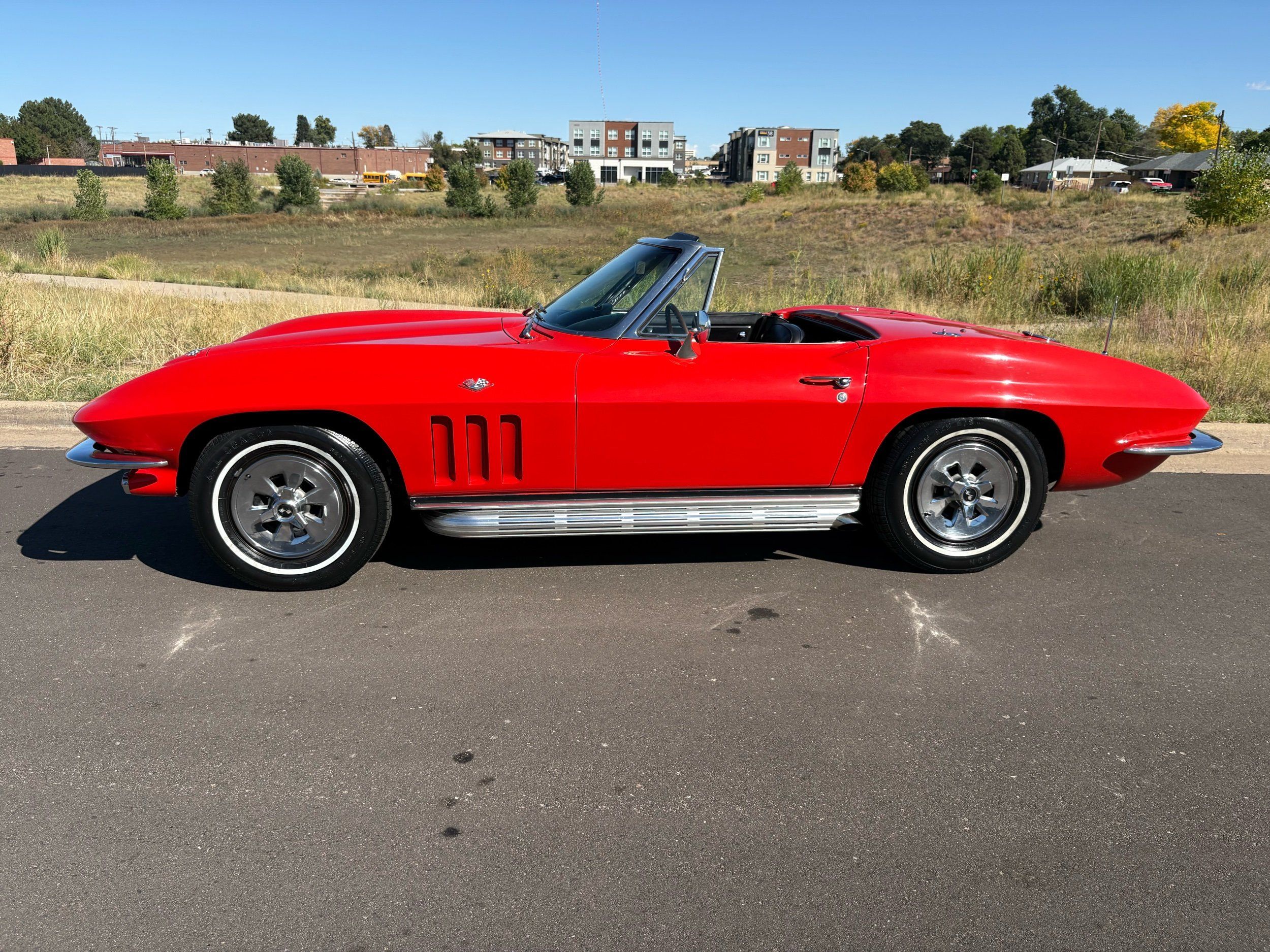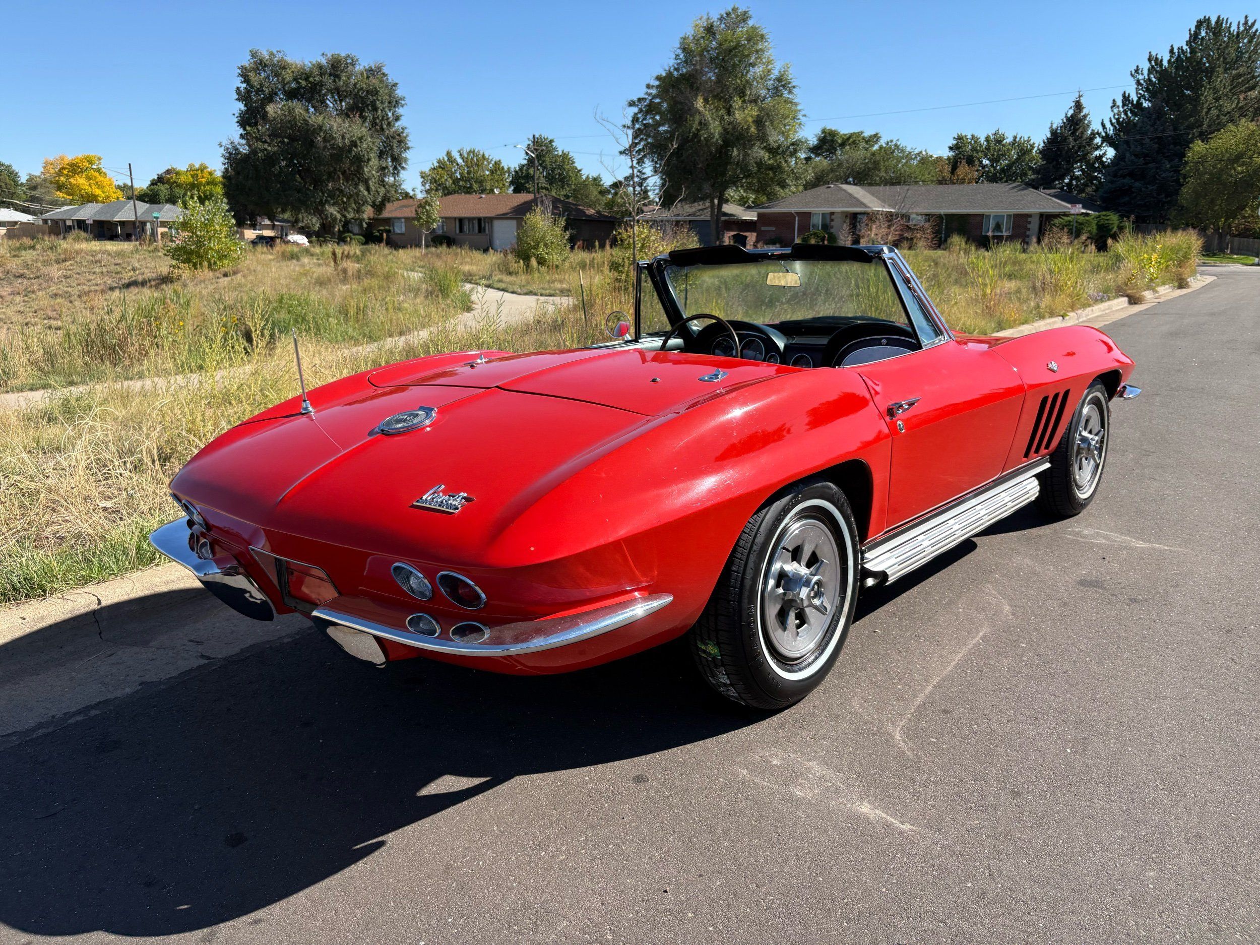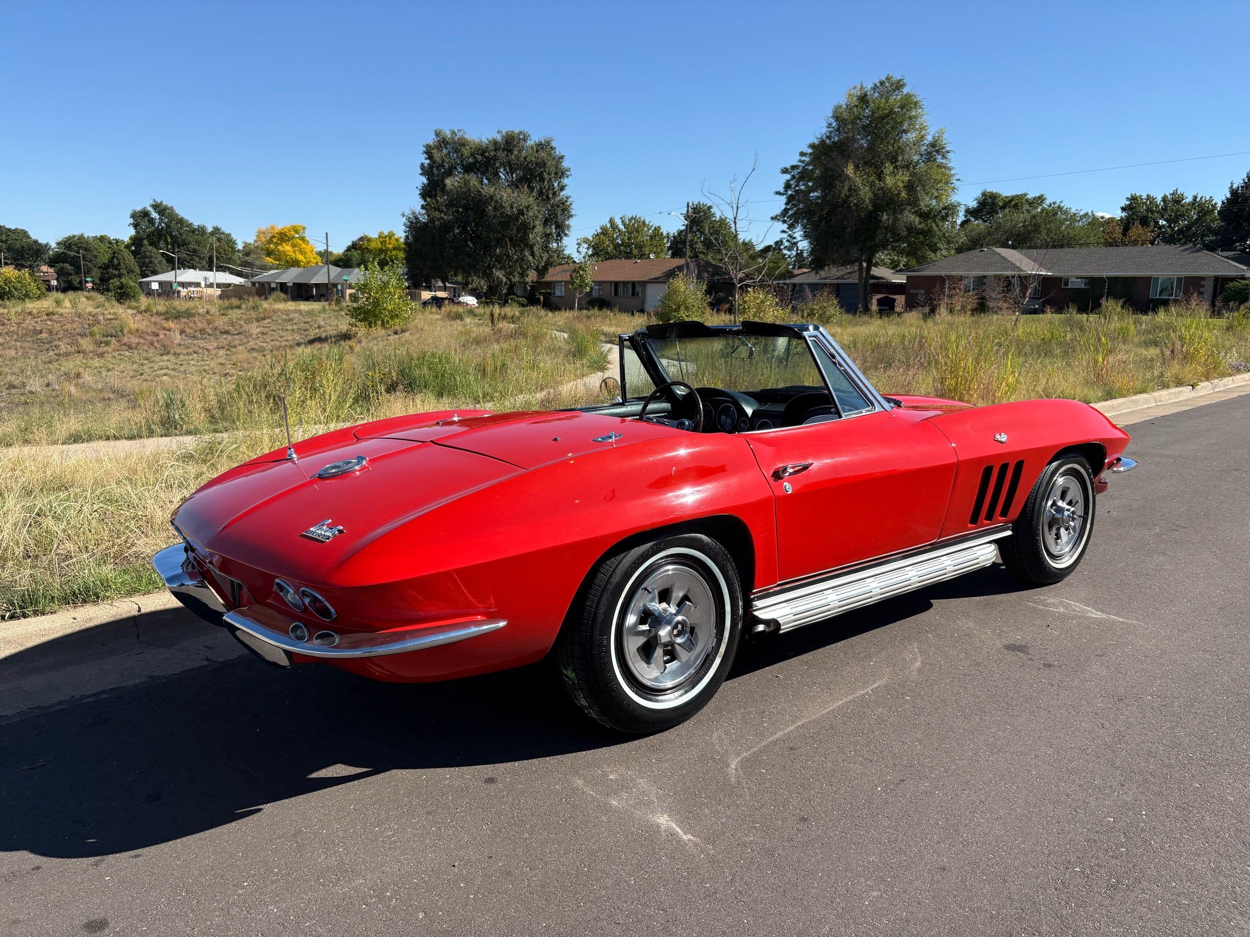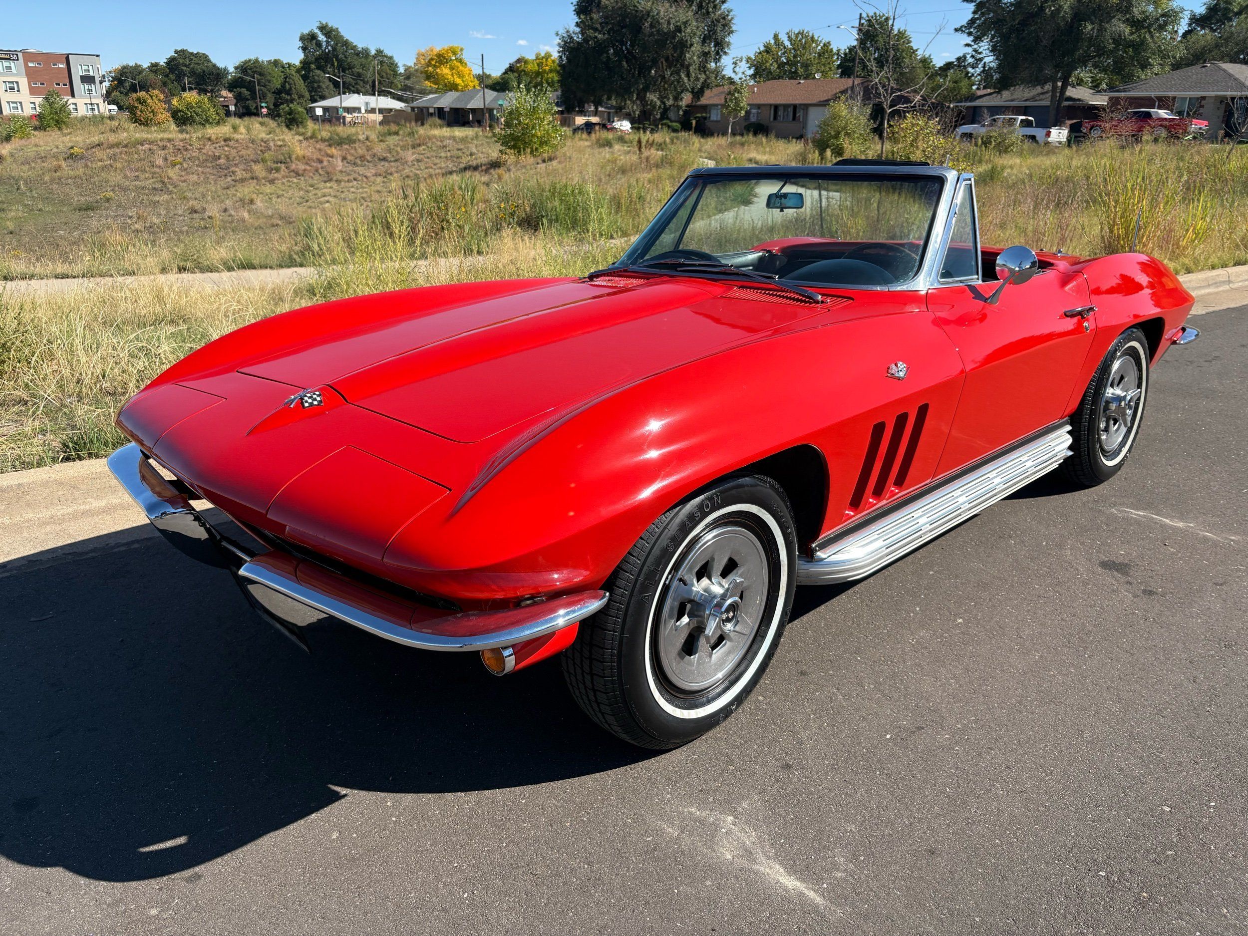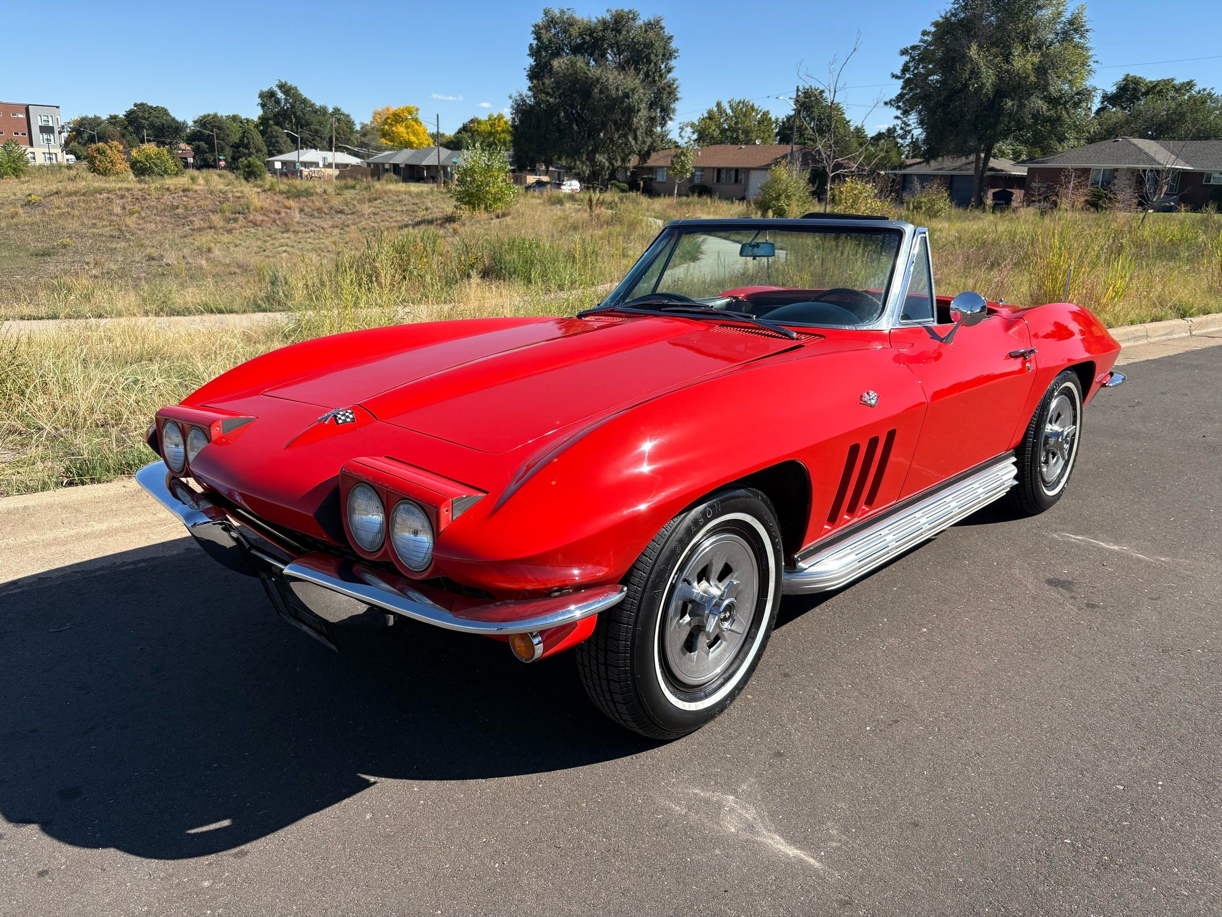 1966 Chevy Corvette stingray convertible very hard to find L79 350HP 327 with 4-speed. This Corvette convertible is finished in red exterior with a black soft top and looks good with the factory side pipes. This particular Corvette has a date code correct motor, but the block has been decked when it was rebuilt so it is a non-numbers matching. The interior is finished in black leather and is an amazing condition and has a brand new soft top. The exterior is also, in very nice condition and appears to not have ever had any collision damage as all the bonding strips are in place like they should be from the factory. We just had the car looked over and mechanically it is sound and ready for the new owner and got brand new tires installed. Call Weisco Motorcars for additional information or to schedule an appointment time to view the vehicle in person.