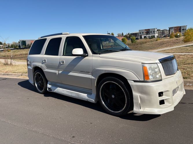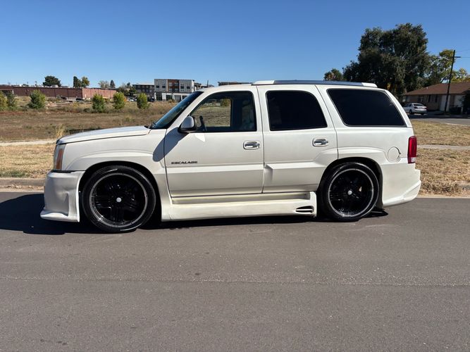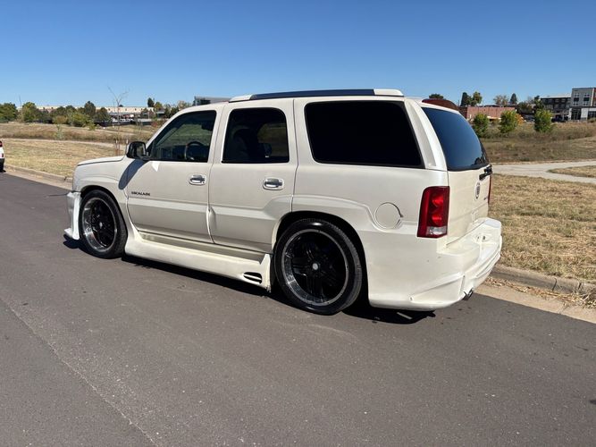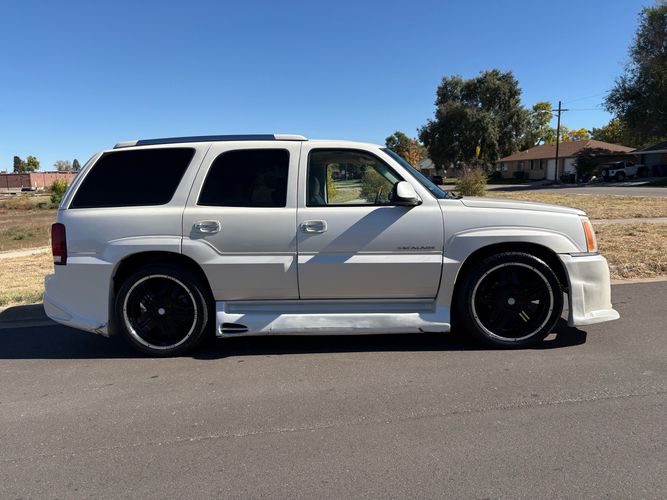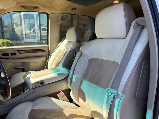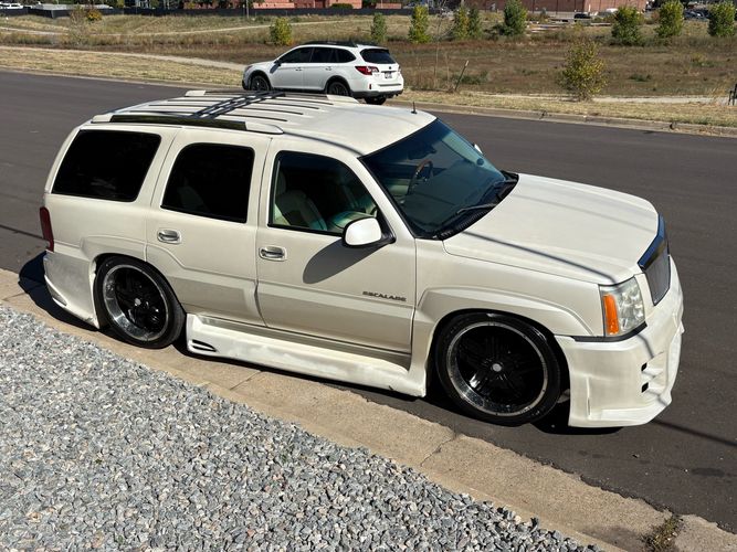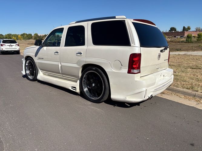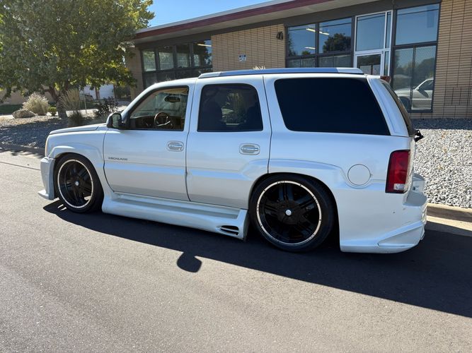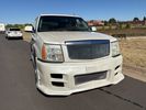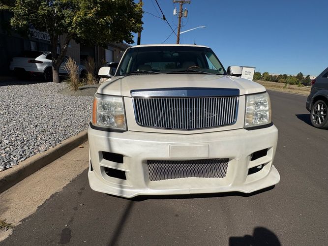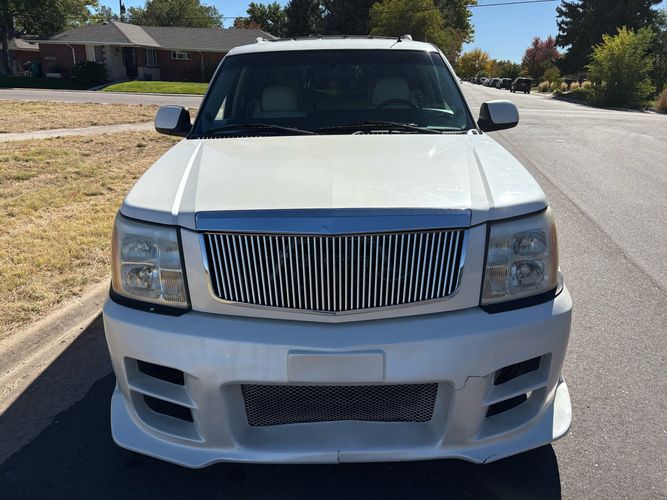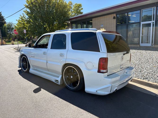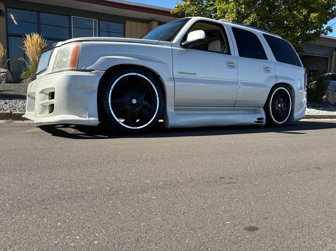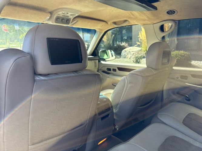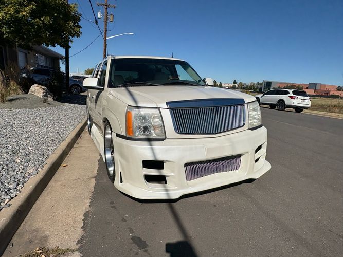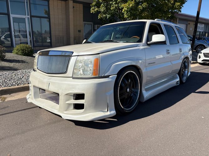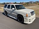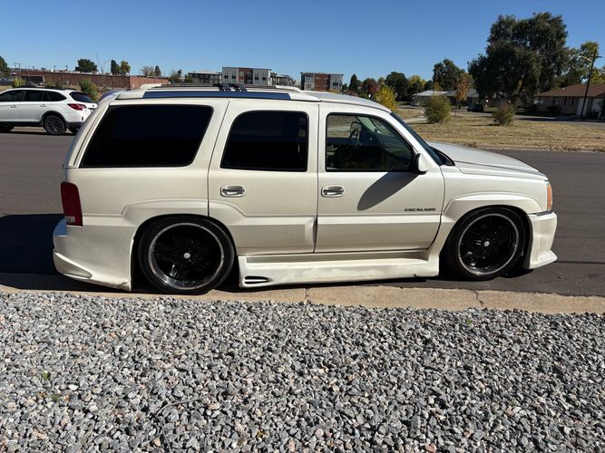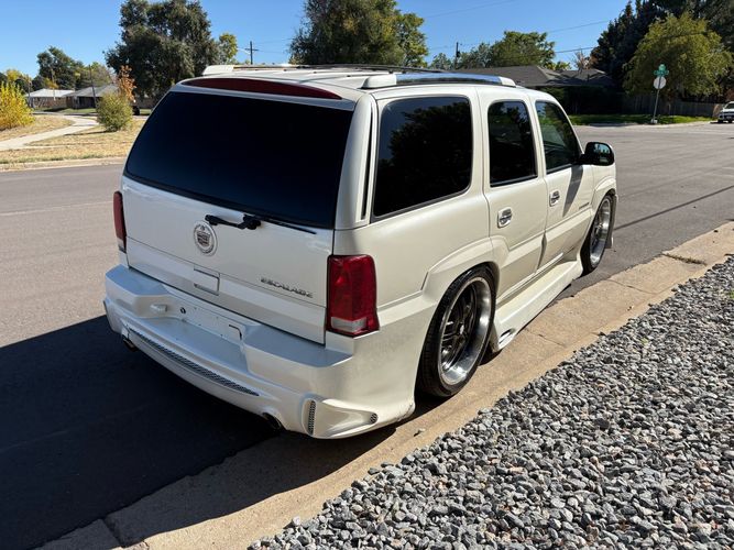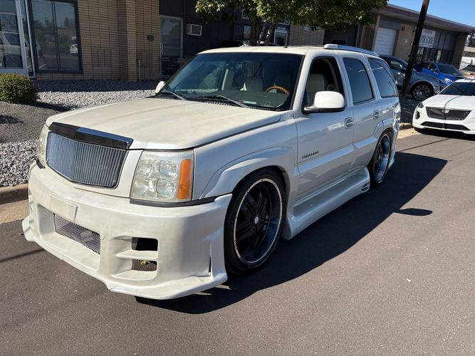 SUPERCHARGED 2002 Cadillac Escalade with only 59,000 original miles. This Escalade is a complete custom build that was built for Sema back in the day. Finished in diamond white exterior over a custom white and tan leather and suede Interor. The list of upgrades done to this Cadillac is absolutely insane I’m sure I’ll miss something on this list. Upgrades like: air ride Suspension that is controlled by remote, Powerdyne supercharger, K40 radar detector, custom body kit, custom leather & suede seats, suede headliner, Hornet alarm, 24” wheels, rear dvd’s, custom dual exhaust, chrome front grill, back up camera and so much more. The body and paint are in pretty good condition. The lower parts of the body kit do have a little bit of damage and we do have an appointment for to go in and get repaired however, we figured we’d advertise a cheaper price and let someone do that your own work since we can’t get it into the shop till the middle of November. Once we do the work and correct the body kit and get everything paint corrected on the vehicle, the price will definitely go up from what we are asking. The interior is an absolutely immaculate condition probably one of the cleanest interiors I’ve seen in an escalating in a long time. There was probably well over 50+ thousand dollars spent on the build and is priced very competitively for what you’re getting essentially you’re buying a stereo system and it comes with an Escalade. Call Weisco motorcars for additional information or to schedule an appointment time to see the vehicle person as we do show all vehicles by appointment only. ( also has a leak on the air ride but still works dropped the price due to this )