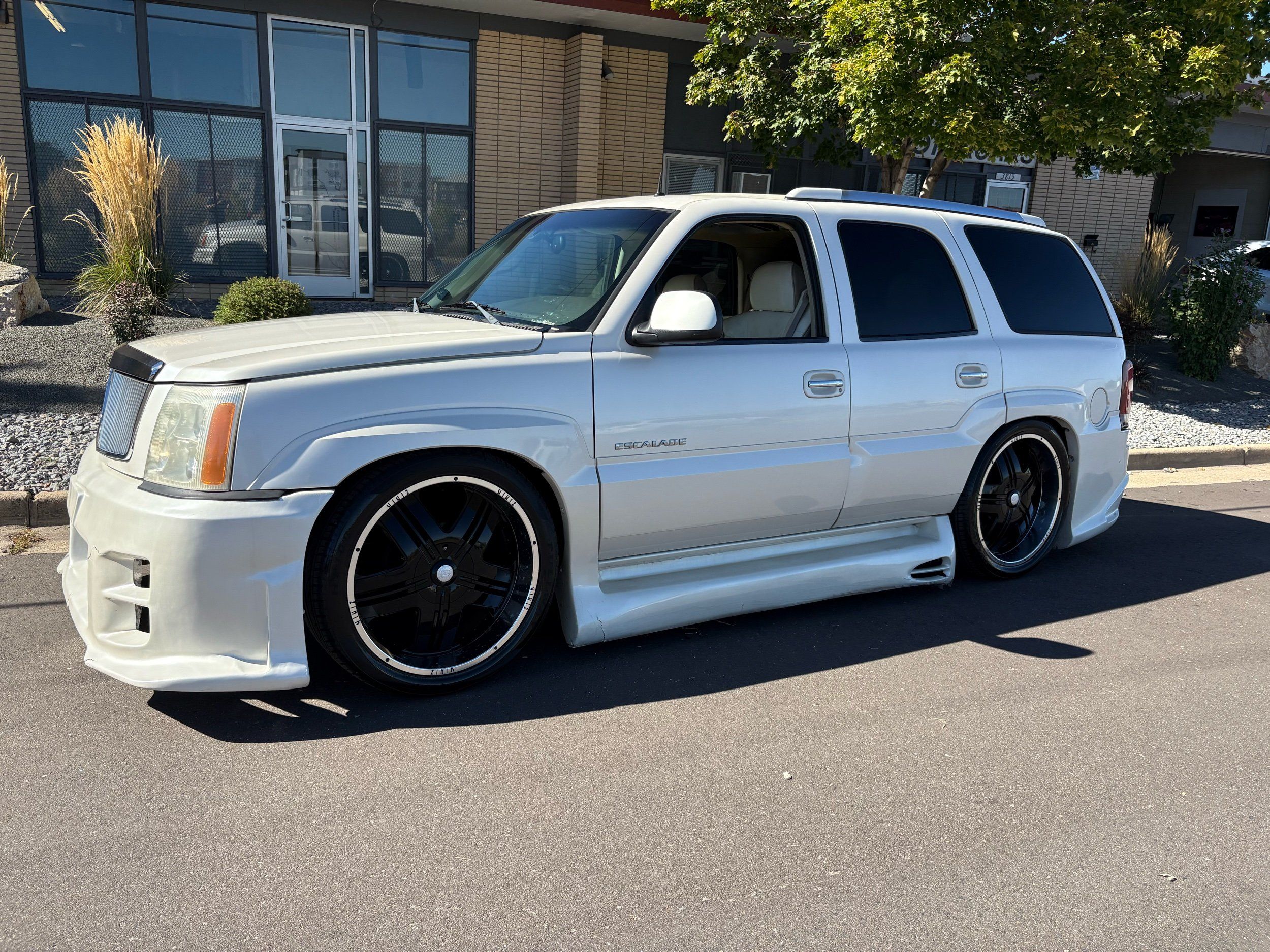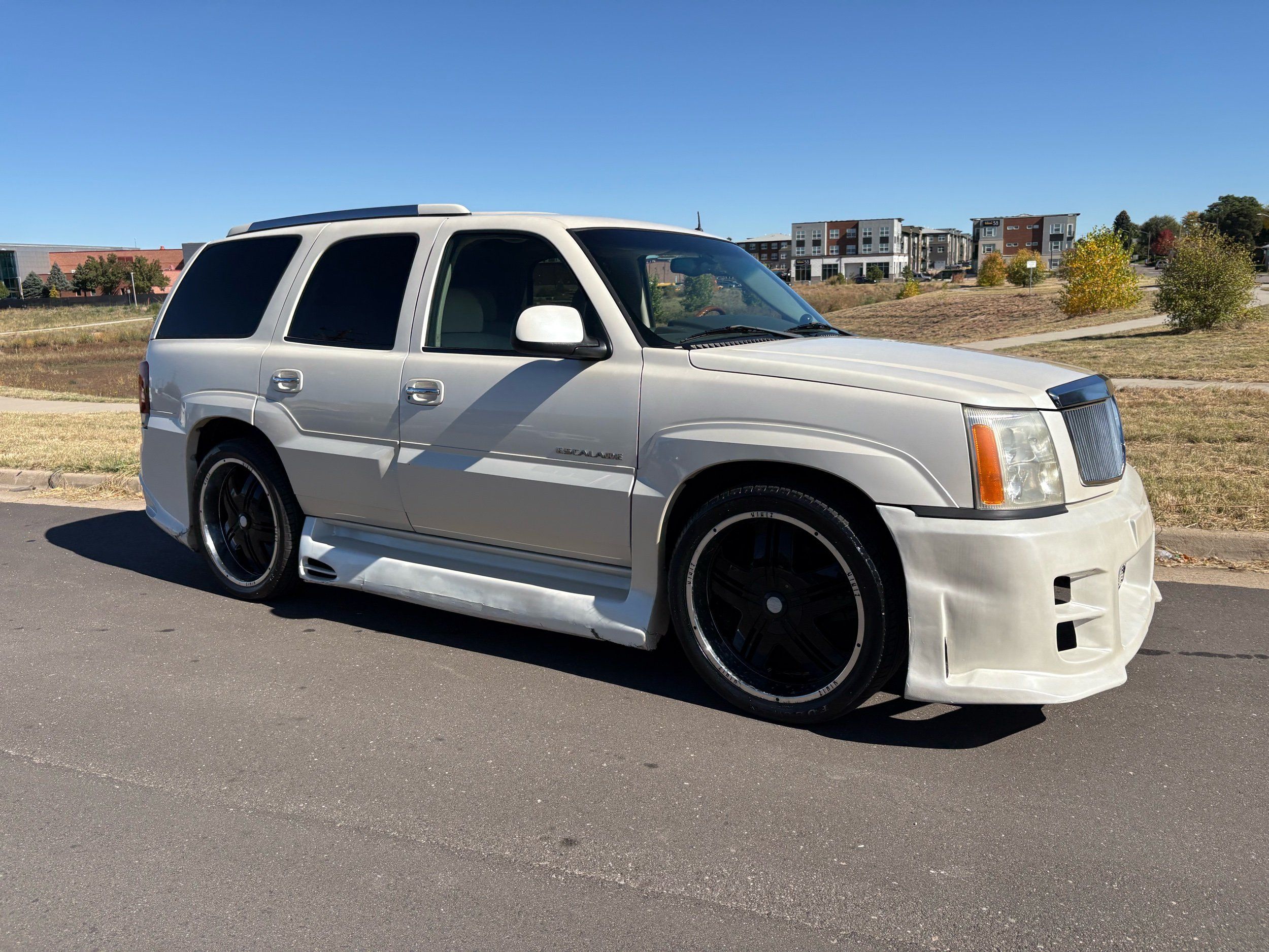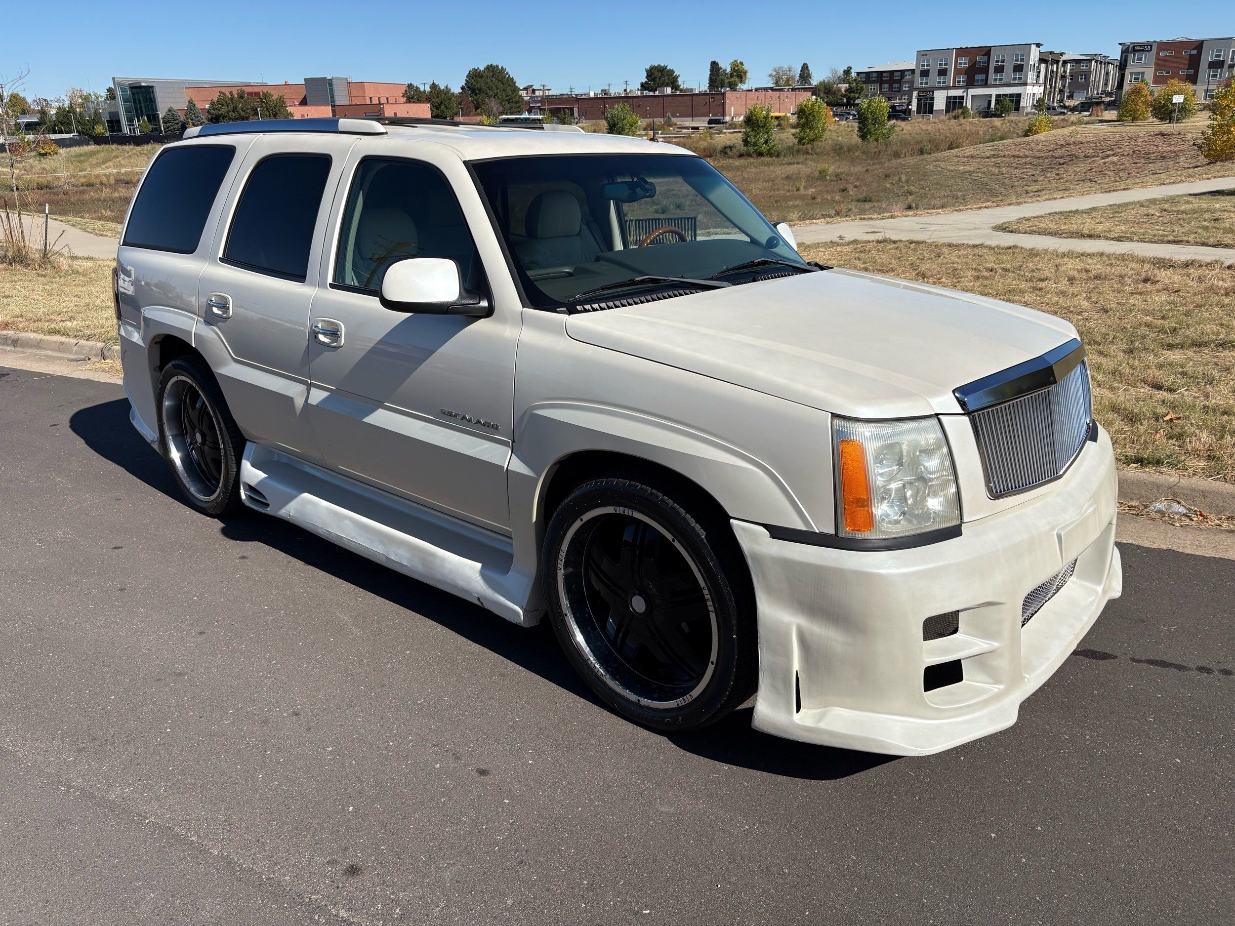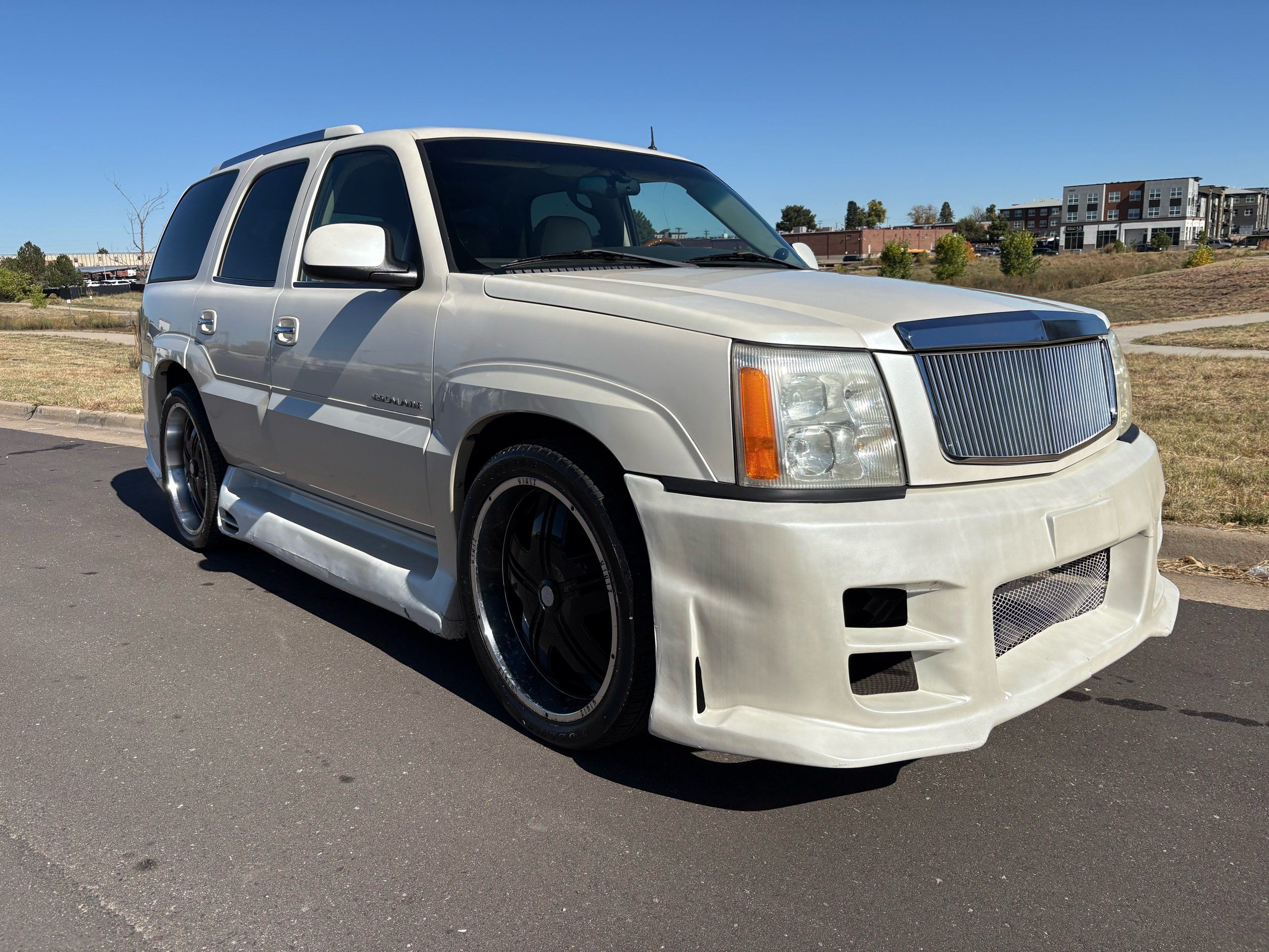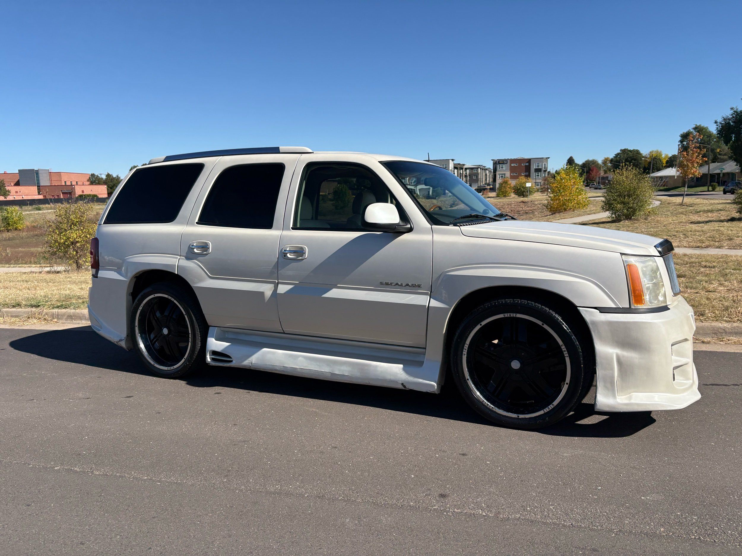 SUPERCHARGED 2002 Cadillac Escalade with only 59,000 original miles. This Escalade is a complete custom build that was built for Sema back in the day. Finished in diamond white exterior over a custom white and tan leather and suede Interor. The list of upgrades done to this Cadillac is absolutely insane I’m sure I’ll miss something on this list. Upgrades like: air ride Suspension that is controlled by remote, Powerdyne supercharger, K40 radar detector, custom body kit, custom leather & suede seats, suede headliner, Hornet alarm, 24” wheels, rear dvd’s, custom dual exhaust, chrome front grill, back up camera and so much more. The body and paint are in pretty good condition. The lower parts of the body kit do have a little bit of damage and we do have an appointment for to go in and get repaired however, we figured we’d advertise a cheaper price and let someone do that your own work since we can’t get it into the shop till the middle of November. Once we do the work and correct the body kit and get everything paint corrected on the vehicle, the price will definitely go up from what we are asking. The interior is an absolutely immaculate condition probably one of the cleanest interiors I’ve seen in an escalating in a long time. There was probably well over 50+ thousand dollars spent on the build and is priced very competitively for what you’re getting essentially you’re buying a stereo system and it comes with an Escalade. Call Weisco motorcars for additional information or to schedule an appointment time to see the vehicle person as we do show all vehicles by appointment only. ( also has a leak on the air ride but still works dropped the price due to this )