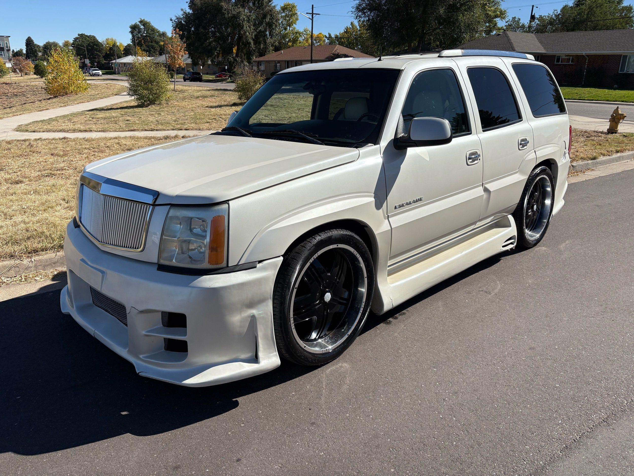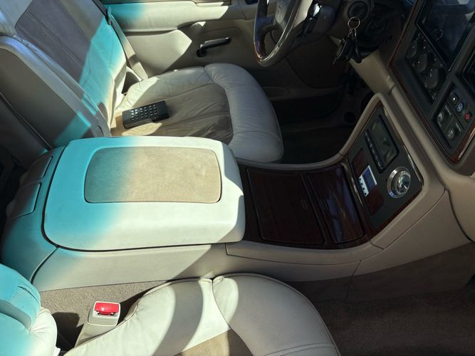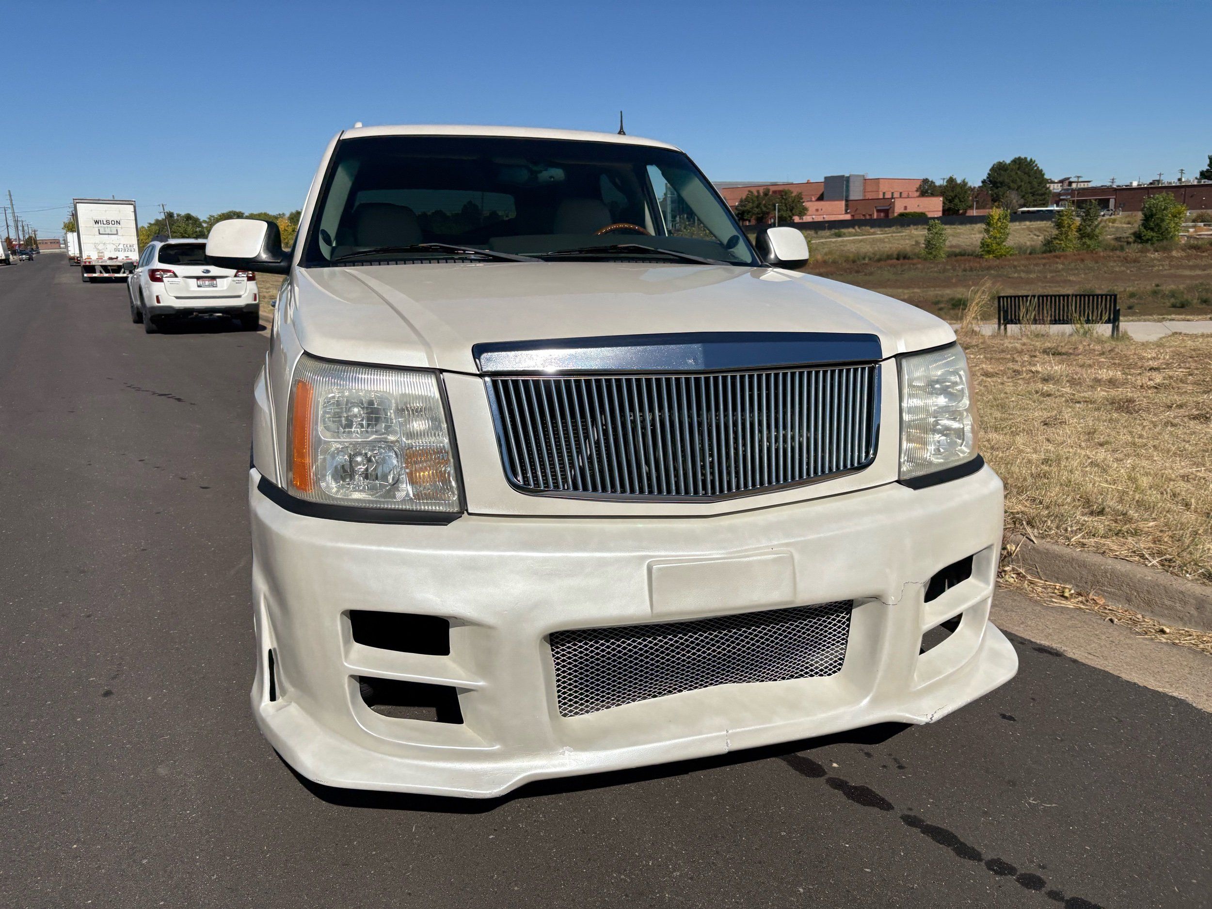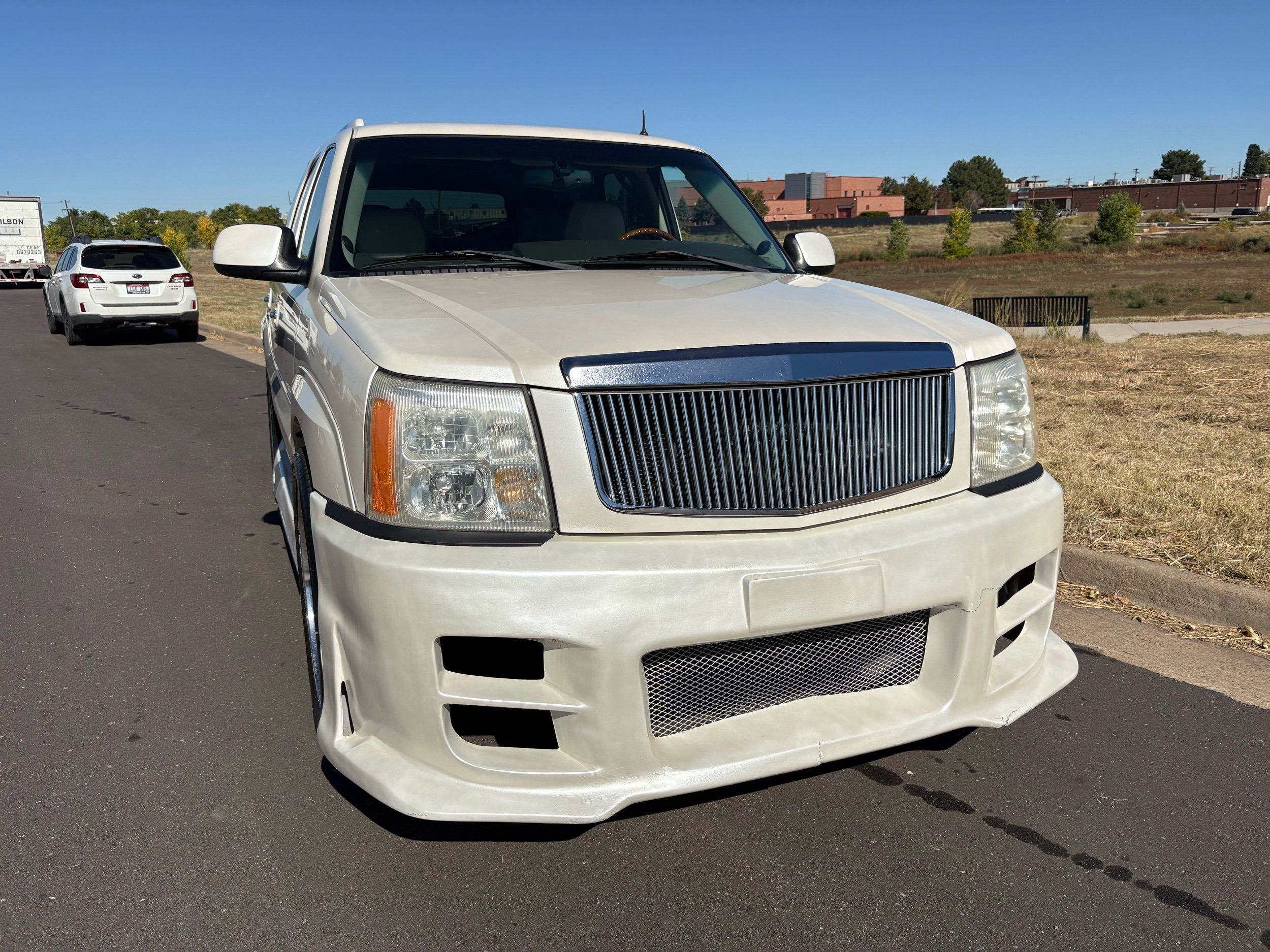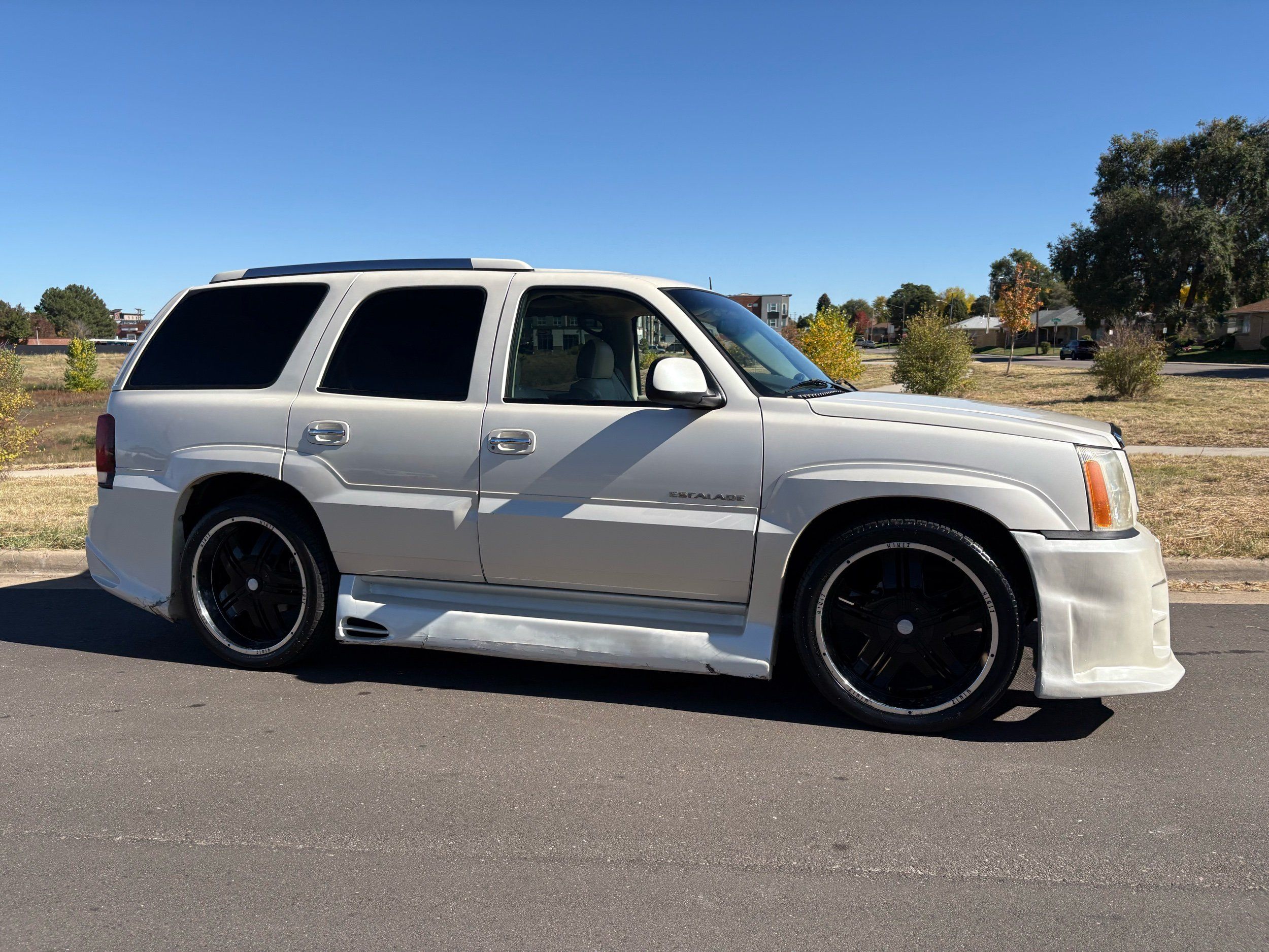 SUPERCHARGED 2002 Cadillac Escalade with only 59,000 original miles. This Escalade is a complete custom build that was built for Sema back in the day. Finished in diamond white exterior over a custom white and tan leather and suede Interor. The list of upgrades done to this Cadillac is absolutely insane I’m sure I’ll miss something on this list. Upgrades like: air ride Suspension that is controlled by remote, Powerdyne supercharger, K40 radar detector, custom body kit, custom leather & suede seats, suede headliner, Hornet alarm, 24” wheels, rear dvd’s, custom dual exhaust, chrome front grill, back up camera and so much more. The body and paint are in pretty good condition. The lower parts of the body kit do have a little bit of damage and we do have an appointment for to go in and get repaired however, we figured we’d advertise a cheaper price and let someone do that your own work since we can’t get it into the shop till the middle of November. Once we do the work and correct the body kit and get everything paint corrected on the vehicle, the price will definitely go up from what we are asking. The interior is an absolutely immaculate condition probably one of the cleanest interiors I’ve seen in an escalating in a long time. There was probably well over 50+ thousand dollars spent on the build and is priced very competitively for what you’re getting essentially you’re buying a stereo system and it comes with an Escalade. Call Weisco motorcars for additional information or to schedule an appointment time to see the vehicle person as we do show all vehicles by appointment only. ( also has a leak on the air ride but still works dropped the price due to this )