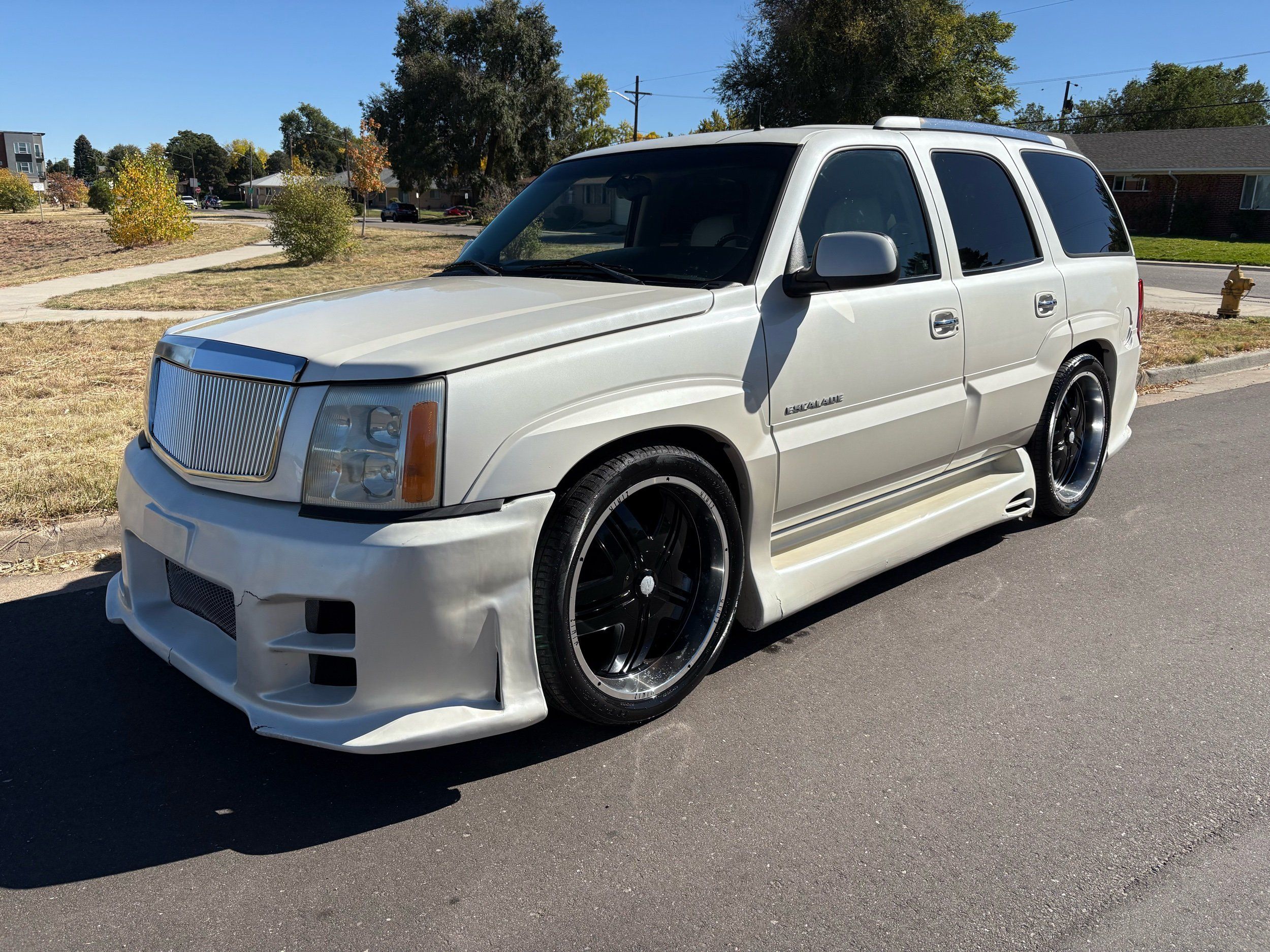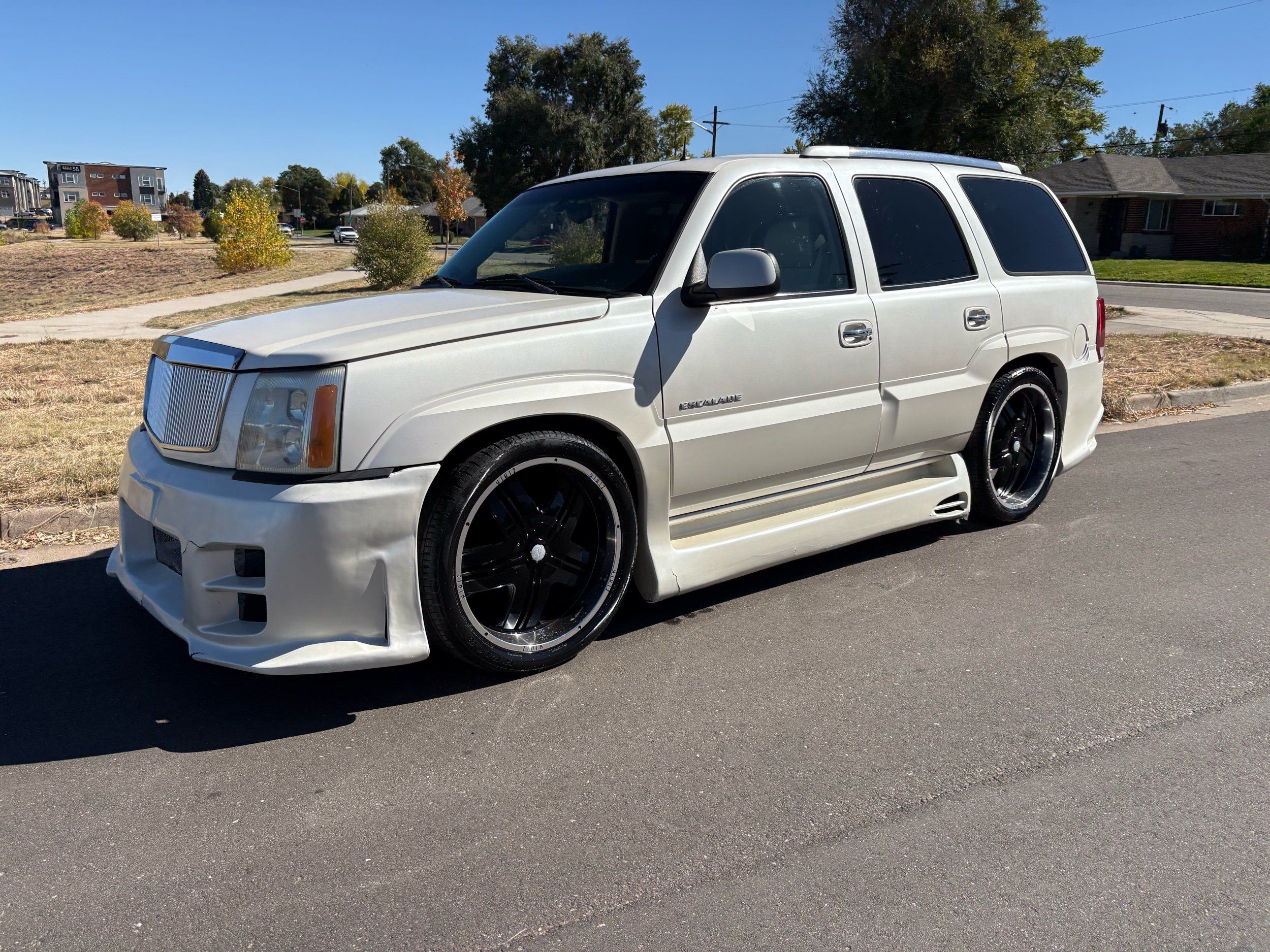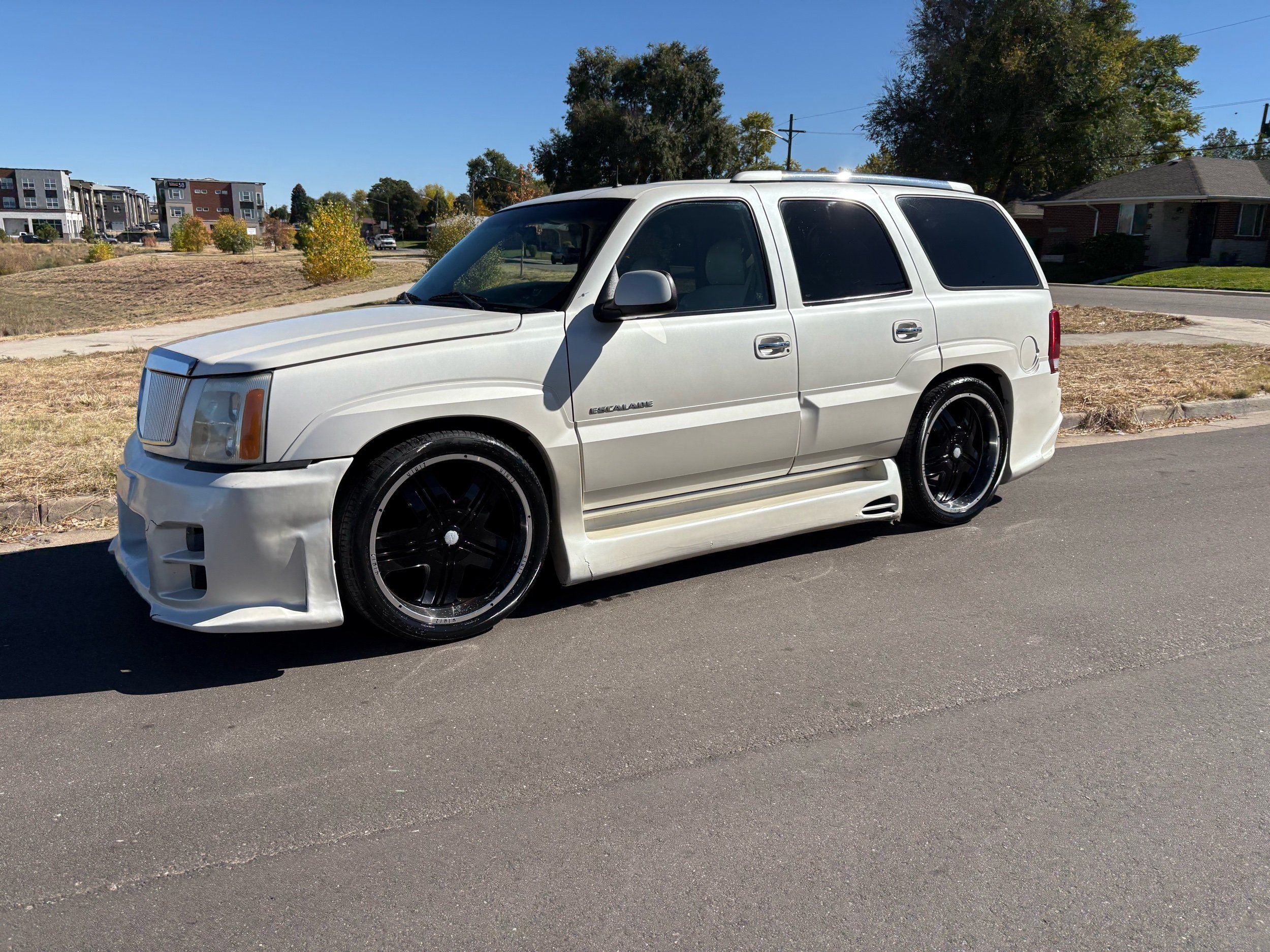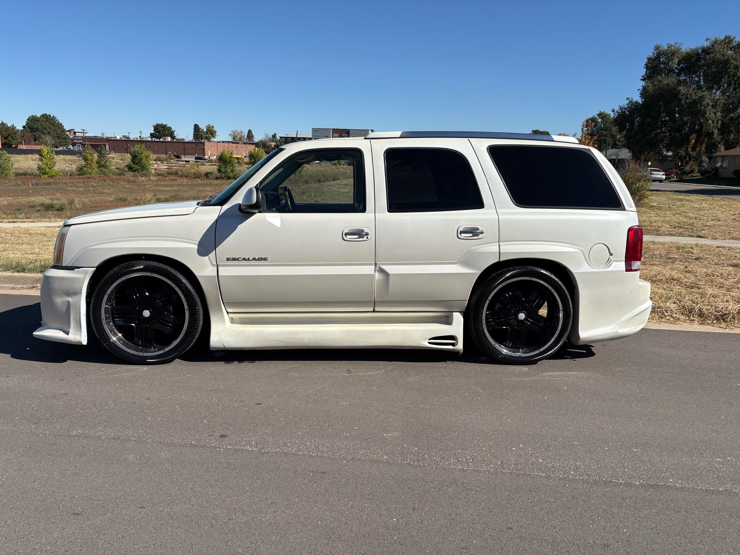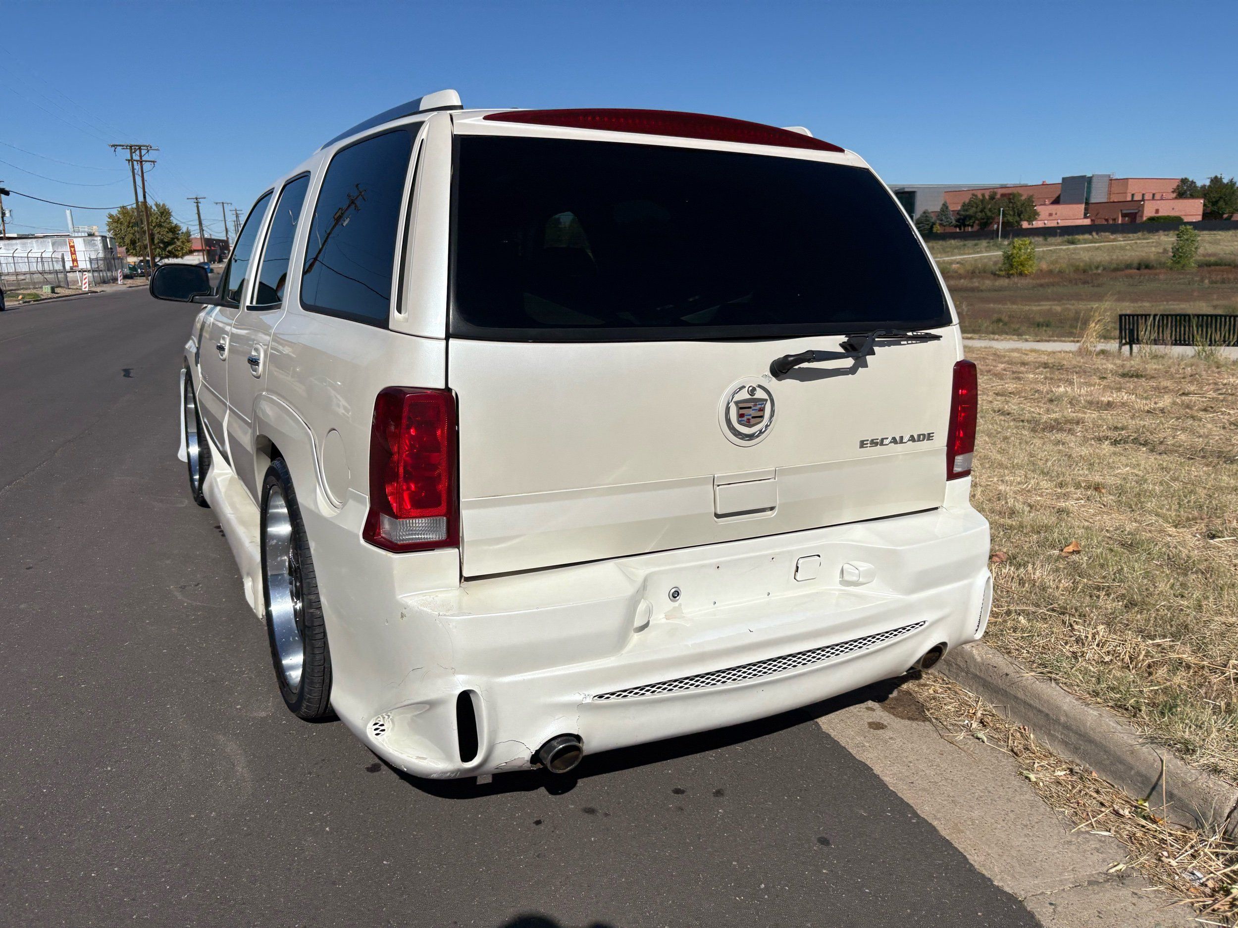 SUPERCHARGED 2002 Cadillac Escalade with only 59,000 original miles. This Escalade is a complete custom build that was built for Sema back in the day. Finished in diamond white exterior over a custom white and tan leather and suede Interor. The list of upgrades done to this Cadillac is absolutely insane I’m sure I’ll miss something on this list. Upgrades like: air ride Suspension that is controlled by remote, Powerdyne supercharger, K40 radar detector, custom body kit, custom leather & suede seats, suede headliner, Hornet alarm, 24” wheels, rear dvd’s, custom dual exhaust, chrome front grill, back up camera and so much more. The body and paint are in pretty good condition. The lower parts of the body kit do have a little bit of damage and we do have an appointment for to go in and get repaired however, we figured we’d advertise a cheaper price and let someone do that your own work since we can’t get it into the shop till the middle of November. Once we do the work and correct the body kit and get everything paint corrected on the vehicle, the price will definitely go up from what we are asking. The interior is an absolutely immaculate condition probably one of the cleanest interiors I’ve seen in an escalating in a long time. There was probably well over 50+ thousand dollars spent on the build and is priced very competitively for what you’re getting essentially you’re buying a stereo system and it comes with an Escalade. Call Weisco motorcars for additional information or to schedule an appointment time to see the vehicle person as we do show all vehicles by appointment only. ( also has a leak on the air ride but still works dropped the price due to this )