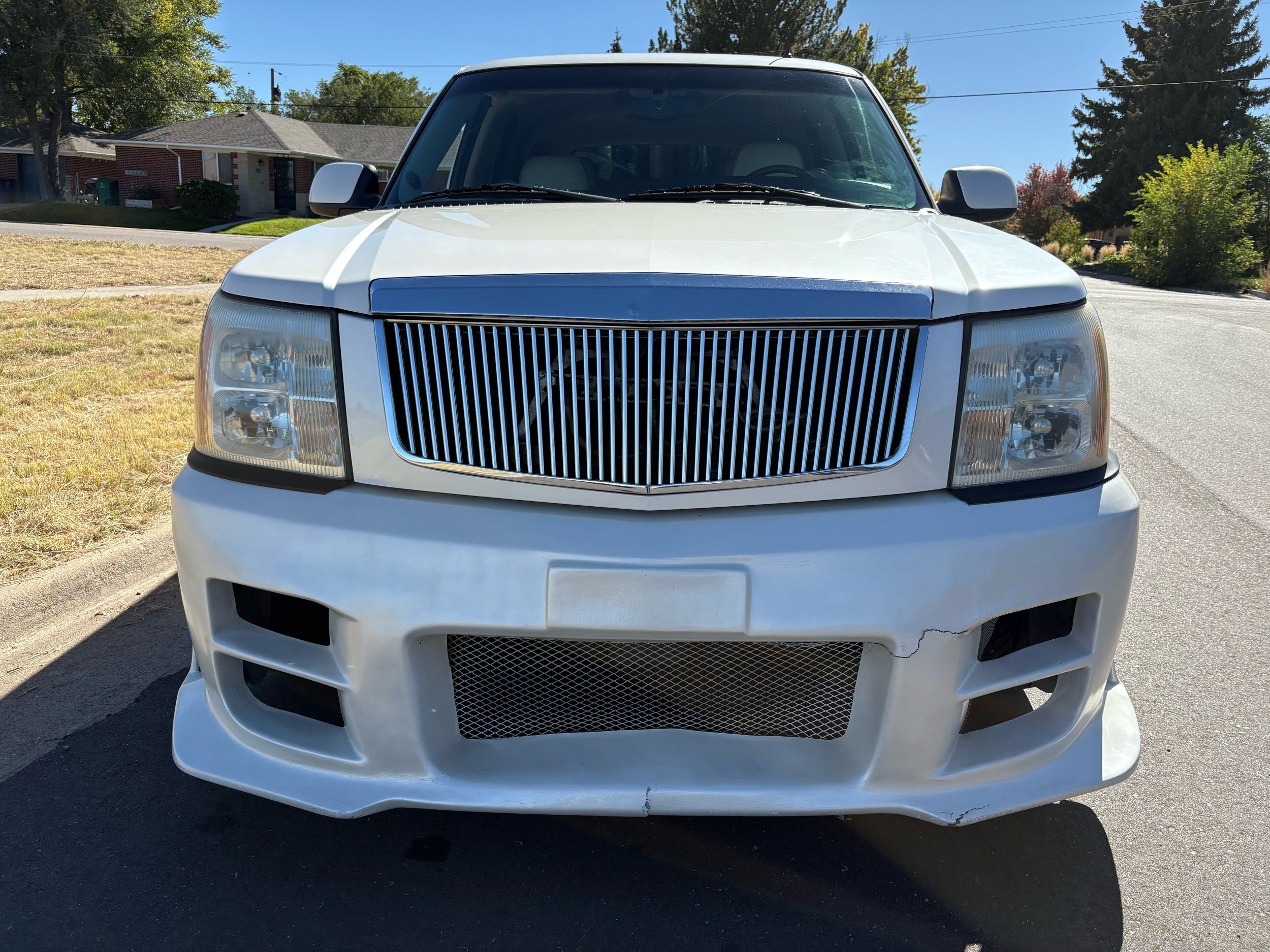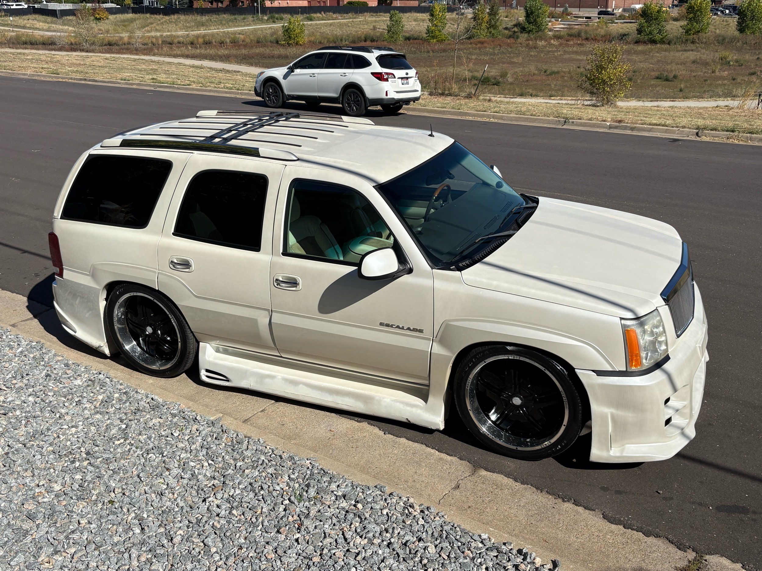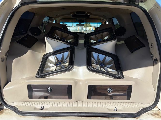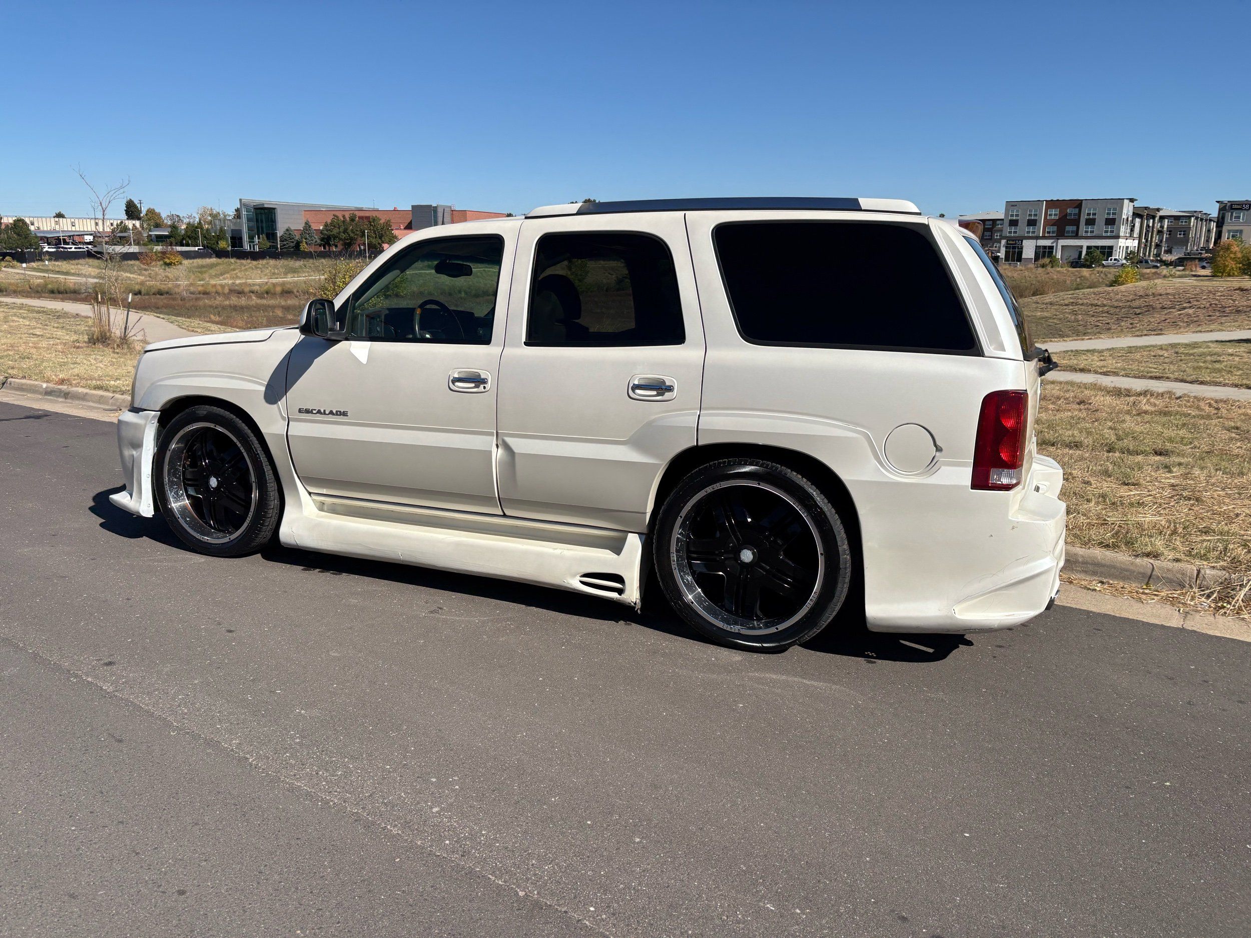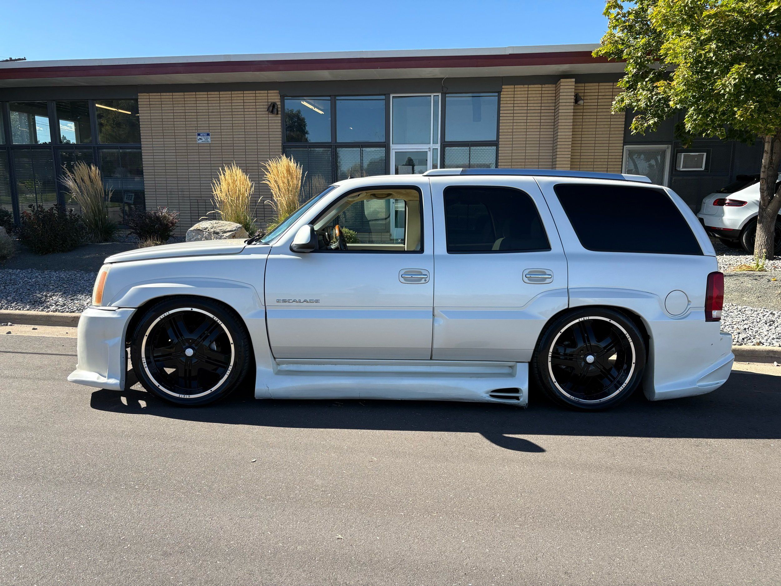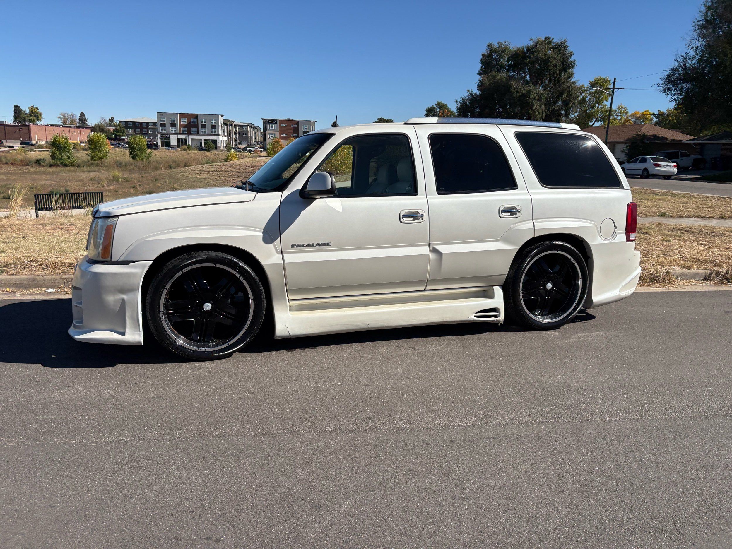 SUPERCHARGED 2002 Cadillac Escalade with only 59,000 original miles. This Escalade is a complete custom build that was built for Sema back in the day. Finished in diamond white exterior over a custom white and tan leather and suede Interor. The list of upgrades done to this Cadillac is absolutely insane I’m sure I’ll miss something on this list. Upgrades like: air ride Suspension that is controlled by remote, Powerdyne supercharger, K40 radar detector, custom body kit, custom leather & suede seats, suede headliner, Hornet alarm, 24” wheels, rear dvd’s, custom dual exhaust, chrome front grill, back up camera and so much more. The body and paint are in pretty good condition. The lower parts of the body kit do have a little bit of damage and we do have an appointment for to go in and get repaired however, we figured we’d advertise a cheaper price and let someone do that your own work since we can’t get it into the shop till the middle of November. Once we do the work and correct the body kit and get everything paint corrected on the vehicle, the price will definitely go up from what we are asking. The interior is an absolutely immaculate condition probably one of the cleanest interiors I’ve seen in an escalating in a long time. There was probably well over 50+ thousand dollars spent on the build and is priced very competitively for what you’re getting essentially you’re buying a stereo system and it comes with an Escalade. Call Weisco motorcars for additional information or to schedule an appointment time to see the vehicle person as we do show all vehicles by appointment only. ( also has a leak on the air ride but still works dropped the price due to this )