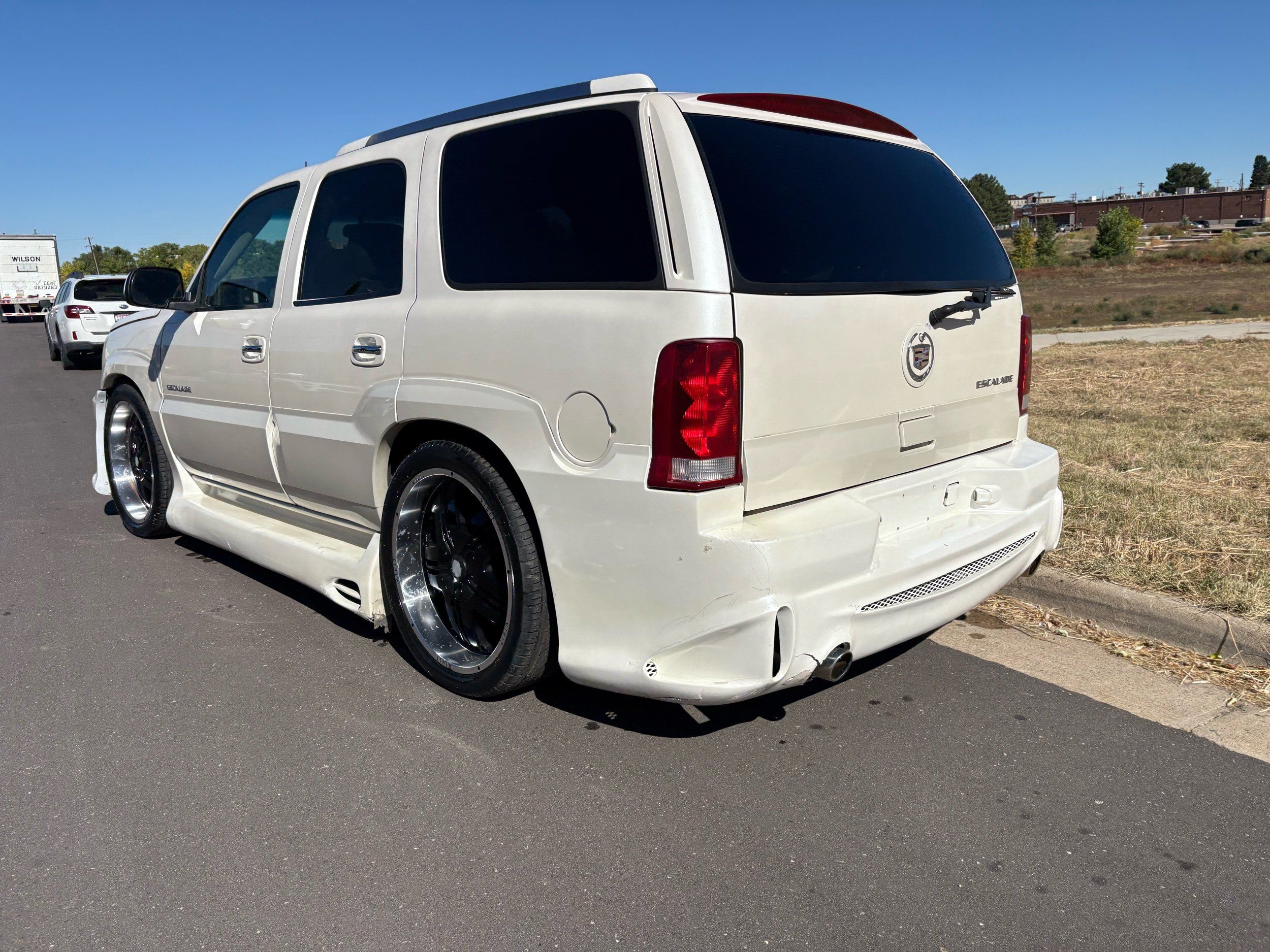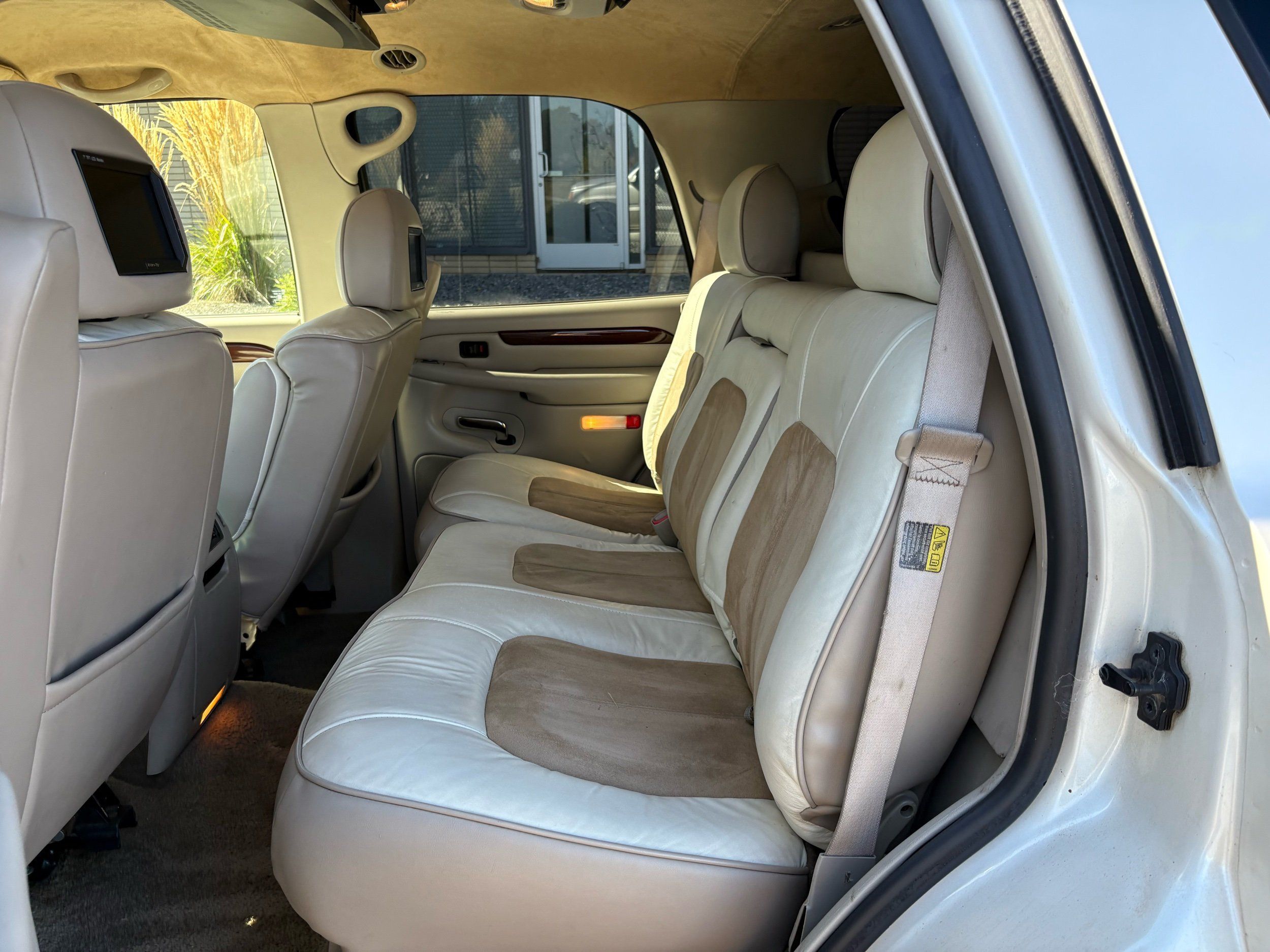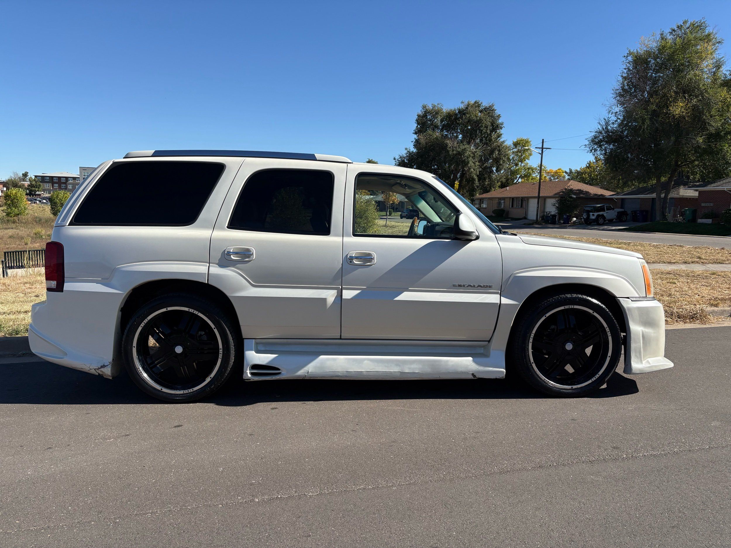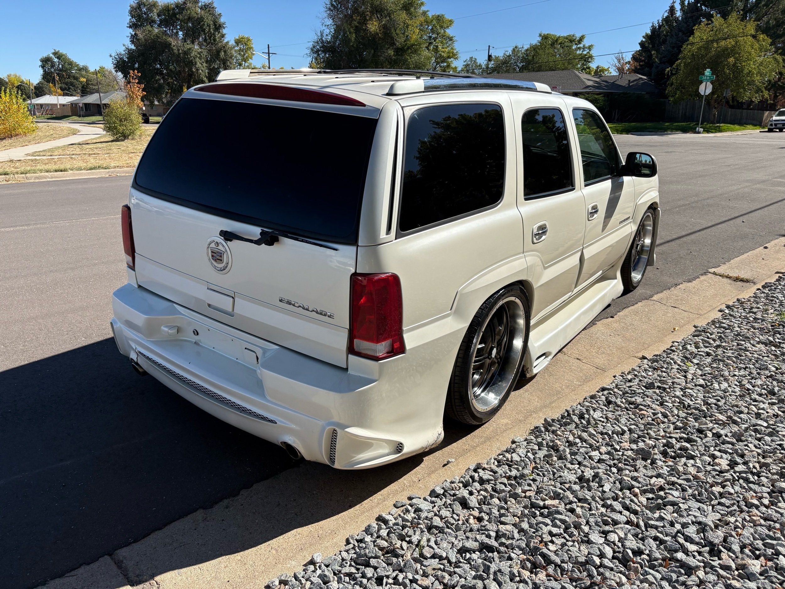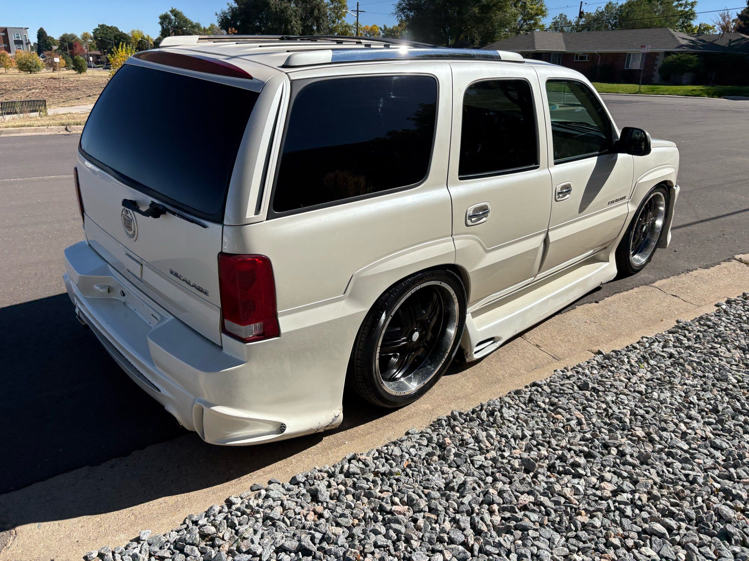 SUPERCHARGED 2002 Cadillac Escalade with only 59,000 original miles. This Escalade is a complete custom build that was built for Sema back in the day. Finished in diamond white exterior over a custom white and tan leather and suede Interor. The list of upgrades done to this Cadillac is absolutely insane I’m sure I’ll miss something on this list. Upgrades like: air ride Suspension that is controlled by remote, Powerdyne supercharger, K40 radar detector, custom body kit, custom leather & suede seats, suede headliner, Hornet alarm, 24” wheels, rear dvd’s, custom dual exhaust, chrome front grill, back up camera and so much more. The body and paint are in pretty good condition. The lower parts of the body kit do have a little bit of damage and we do have an appointment for to go in and get repaired however, we figured we’d advertise a cheaper price and let someone do that your own work since we can’t get it into the shop till the middle of November. Once we do the work and correct the body kit and get everything paint corrected on the vehicle, the price will definitely go up from what we are asking. The interior is an absolutely immaculate condition probably one of the cleanest interiors I’ve seen in an escalating in a long time. There was probably well over 50+ thousand dollars spent on the build and is priced very competitively for what you’re getting essentially you’re buying a stereo system and it comes with an Escalade. Call Weisco motorcars for additional information or to schedule an appointment time to see the vehicle person as we do show all vehicles by appointment only. ( also has a leak on the air ride but still works dropped the price due to this )